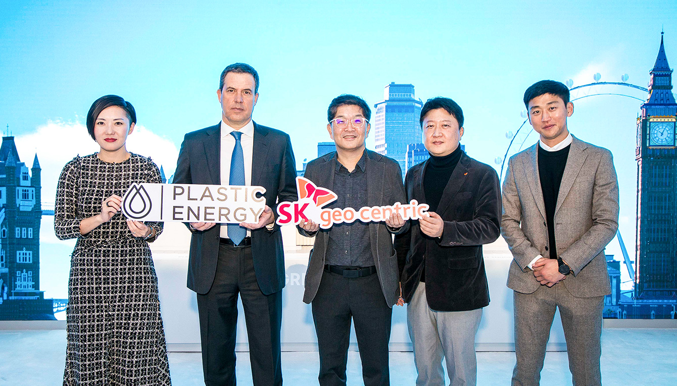 ▲ SK지오센트릭과 英 플라스틱 에너지 주요 관계자들이 美 CES 2023에 전시된 SK그룹관에서 기념촬영을 하고 있다. (왼쪽부터) 잉 스태튼(Ying Staton) 플라스틱 에너지 사업개발담당(Head of Corporate Development), 브루노 귀용(Bruno Guillon) 플라스틱 에너지 부사장(Chief Commercial Officer), 나경수 SK지오센트릭 사장, 이종혁 SK지오센트릭 그린사업개발담당