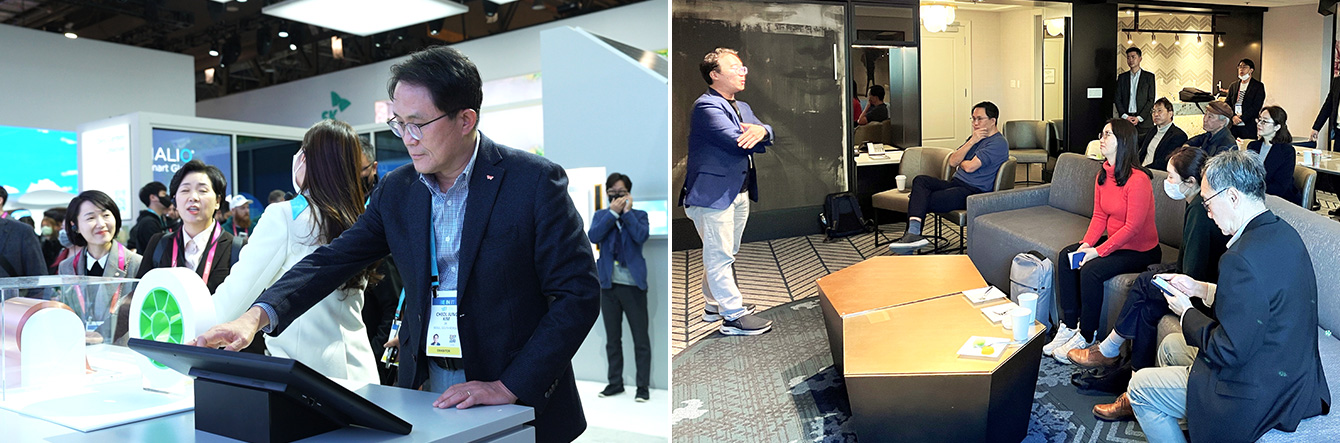 ▲ (좌) 올해 1월, 美 라스베이거스에서 열린 CES 2023에 참관한 SKIET 김철중 사장이 LiBS 전시내용을 살펴보고 있다. / (우) SK이노베이션 계열 사외이사들이 美 CES 2023 개막 前 세미나에 참석해 CES에 주목해야 할 트렌드들에 대해 설명을 듣고 토론을 나누고 있다.