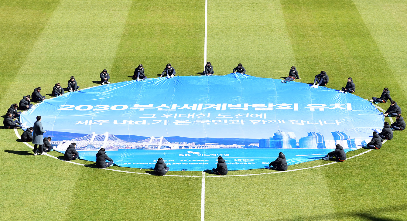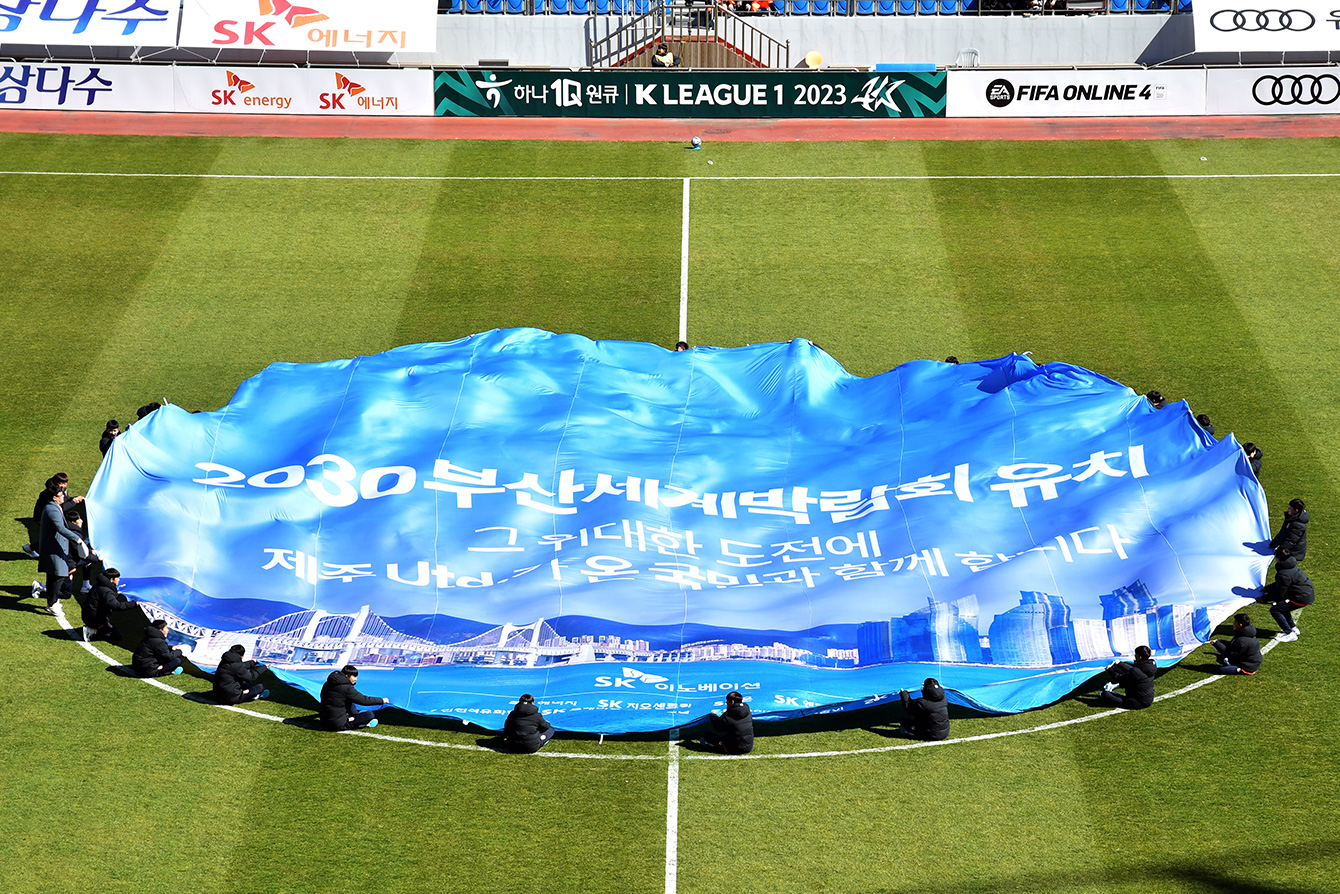 이어서 사전행사의 하이라이트인, 2030 부산세계박람회 유치를 기원하는 대형 현수막이 경기장에 등장했다. 이는 SK이노베이션과 제주UTD가 올해 4월 실사단 방문과 11월 개최지 선정을 앞둔 ‘2030 세계박람회’의 부산 유치를 기원하고자 선보인 특별 퍼포먼스로, 제주도 내 유소년 축구선수 30명과 함께 했다. 이를 통해 부산세계박람회 유치를 기원하는 SK이노베이션의 마음이 밀려오는 파도처럼 제주도민에게 전달됐다.