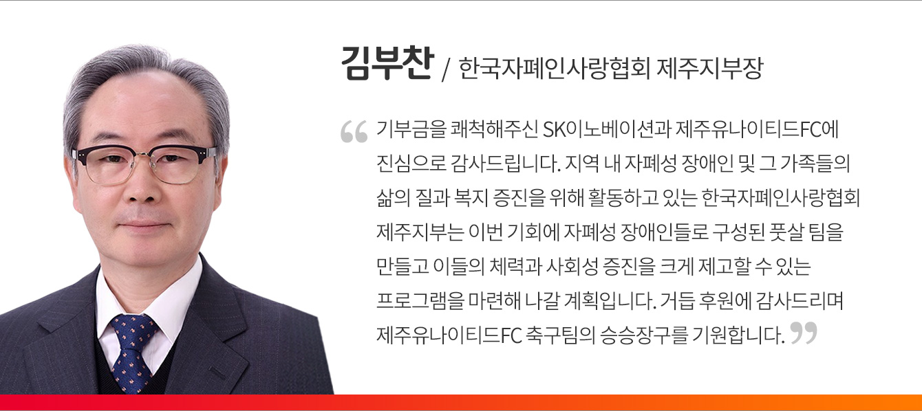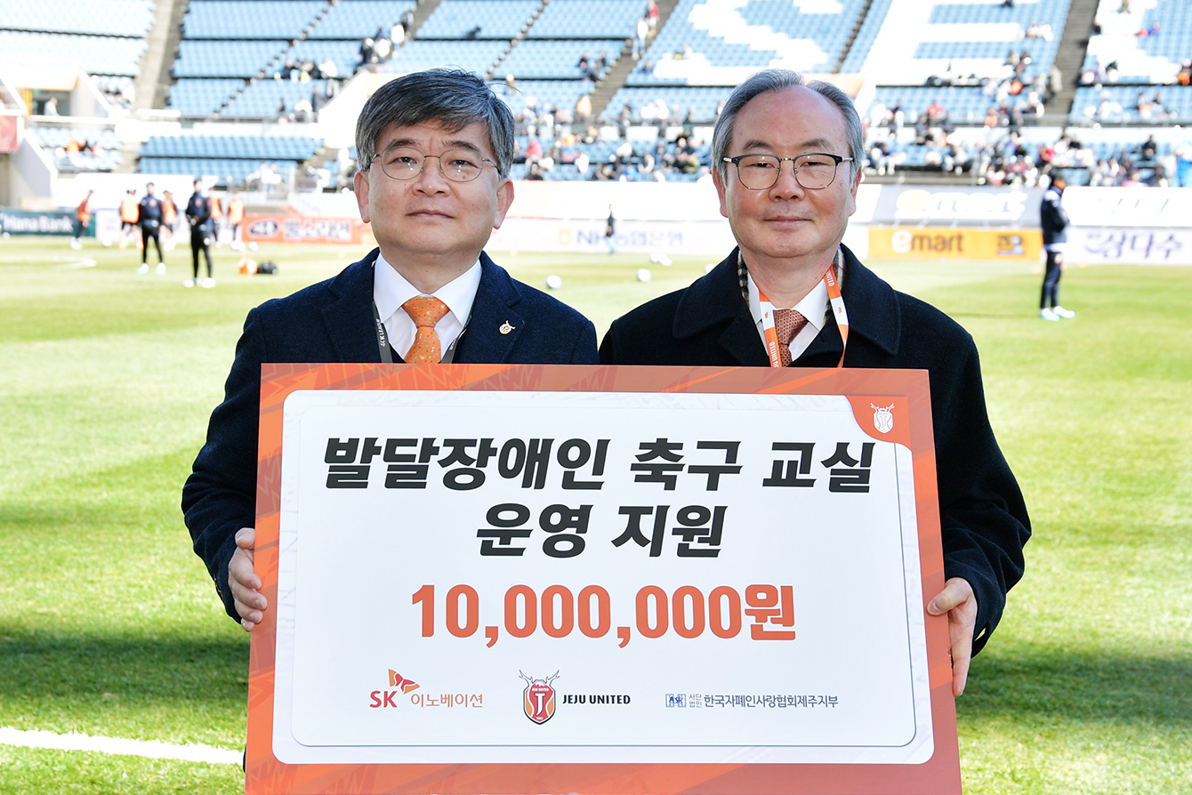 본격적인 경기 시작에 앞서 특별한 사전행사들이 진행됐다. 먼저, 제주UTD 구창용 대표이사가 구단을 대표해 한국자폐인사랑협회 제주지부에 기부금 1천만원을 전달하며 지역사회를 위한 따뜻한 마음을 나눴다. 전달된 기부금은 제주 지역에 거주하는 발달장애인들의 사회성 및 운동능력 향상을 위한 축구 교실 운영에 사용될 계획이다.
