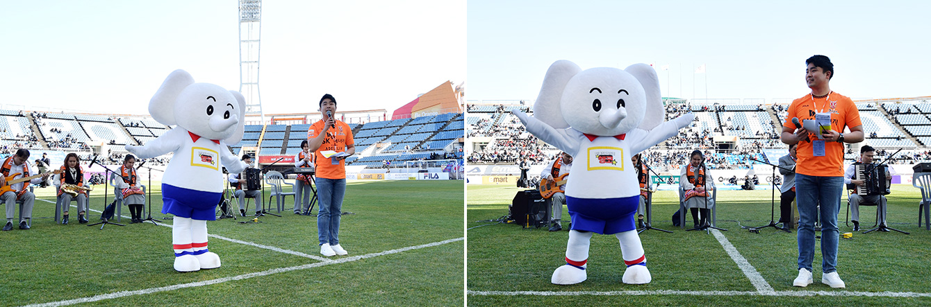 제주UTD의 홈 개막전 경기가 펼쳐진 날, 제주월드컵경기장에 아주 특별한 손님이 방문했다. SK이노베이션의 친환경 메시지를 전하는 캐릭터 ‘행코(행복코끼리)’가 자연의 섬, 제주가 품은 축구단인 제주UTD를 찾은 것이다.