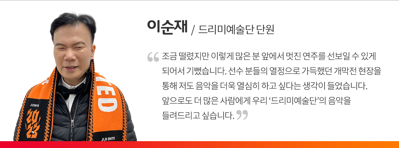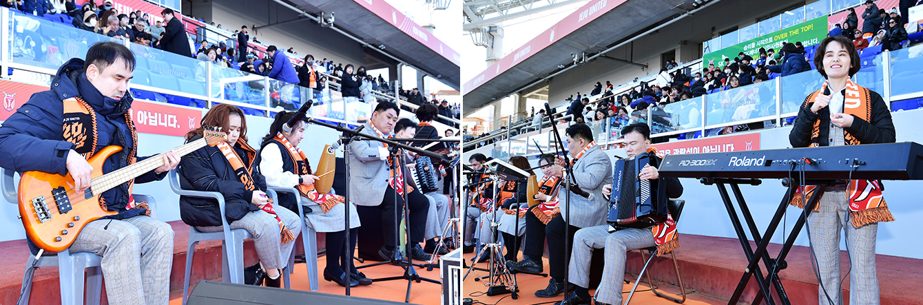 ▲ 제6회 GMF에서 수상한 ‘드리미예술단’이 제주UTD의 홈 개막전을 축하하는 환상적인 연주를 하고 있다.