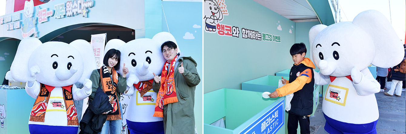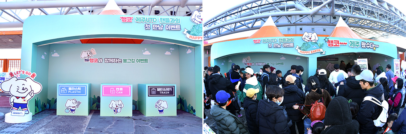 ▲ (좌) 제주월드컵경기장에서 열린 제주UTD의 홈 개막전을 앞두고 경기장 밖에서 진행된 행코와 함께하는 ‘봉그깅 이벤트’ 부스 / (우) 제주UTD 홈 개막전 관람객들이 경기장에서 수거한 쓰레기를 행코 부스에서 분리수거 하고 있다.