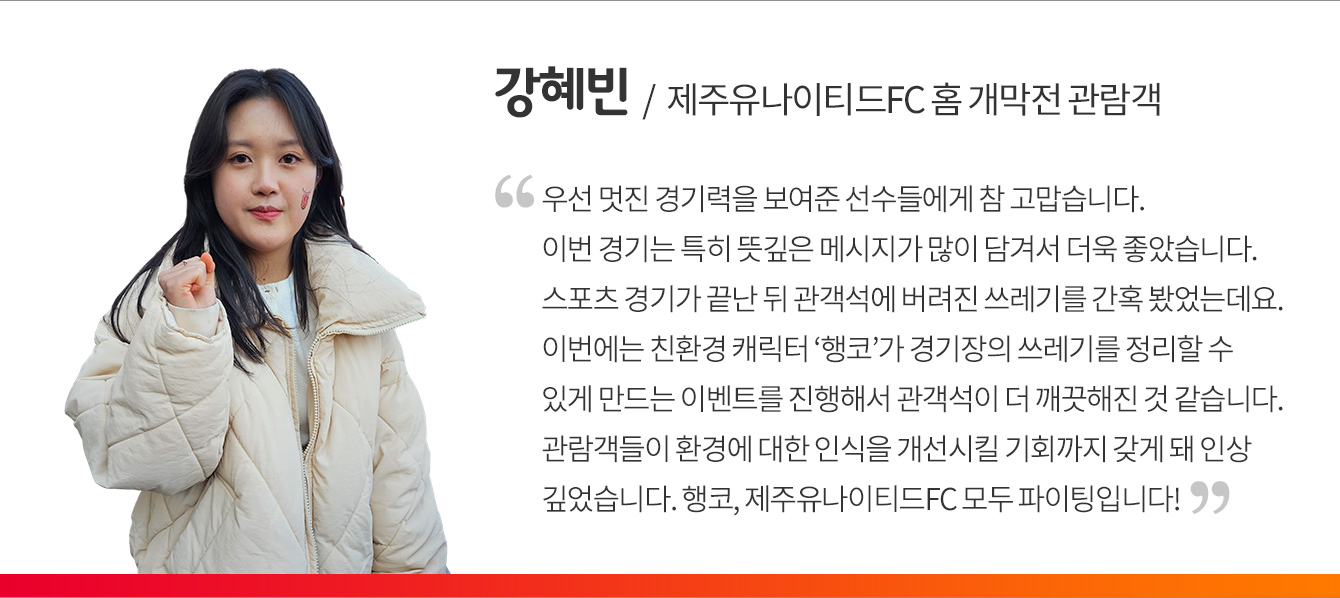 경기가 끝난 뒤 관람객들은 행코가 그려진 쓰레기봉투에 좌석 주변에 떨어진 쓰레기까지 모두 주워 봉투를 가득 채웠다. 이처럼 관람객들은 제주월드컵경기장 주변에서 자발적으로 쓰레기를 주우며 제주UTD의 ESG 활동에 동참했다.