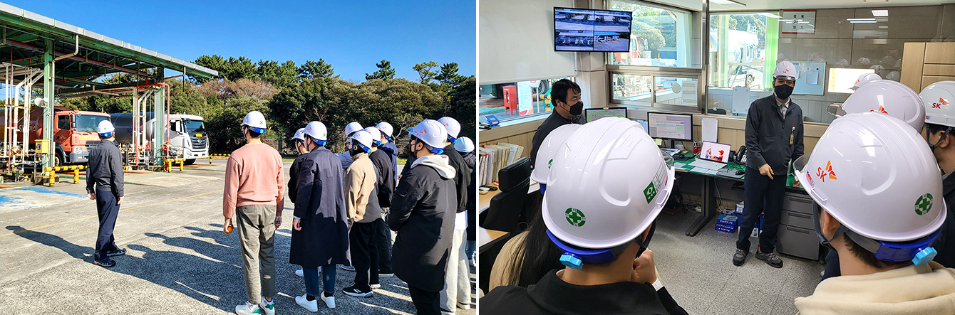 SK에너지 물류센터는 석유제품을 저장하는 저유소 역할과 전국 주유소로 출하 업무를 담당하고 있는 곳이다. 제주물류센터에 방문한 신입사원들은 전국 물류센터 현황과 물류 ESG 로드맵(Roadmap)에 관해 설명을 듣고 질의응답 시간을 가진 후, 물류센터 현장을 직접 둘러보는 시간을 가졌다.