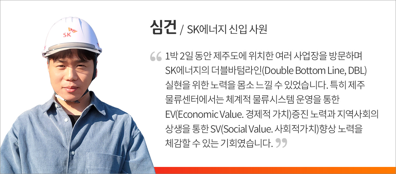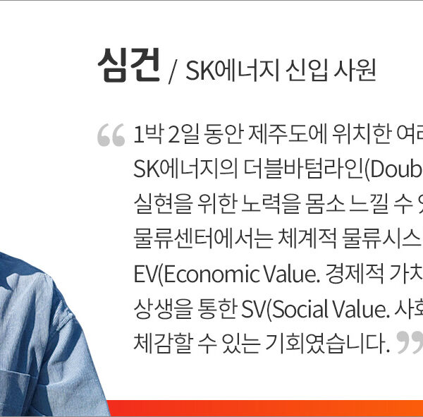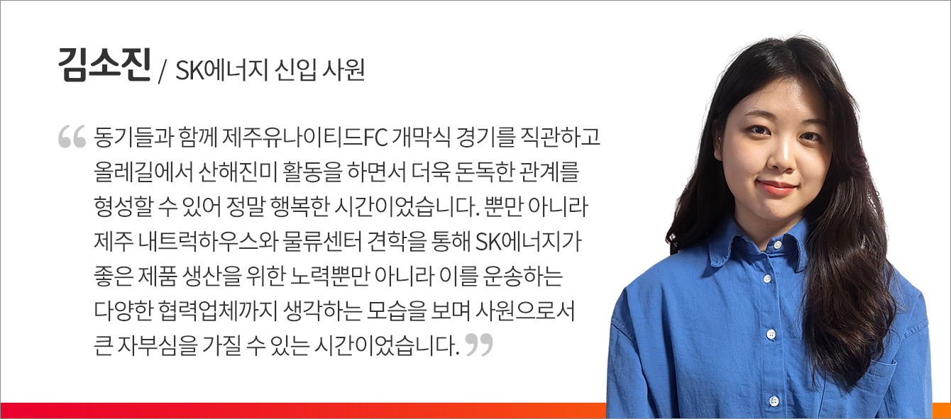 이번 SK에너지 신입사원들의 제주 나들이는 SK의 구성원이 된 것에 대한 환영 및 축하와 동시에 회사에 대해 이해도를 높일 수 있는 특별한 시간이었다. SK이노베이션 계열의 ESG 활동에 직접 참여하며 개인과 회사의 환경 보호 실천에 대한 중요성을 배우는 한편, SK에너지의 경제/사회적 가치 창출도 직접 보고 듣고 배울 수 있어 더욱 뜻깊었다.
