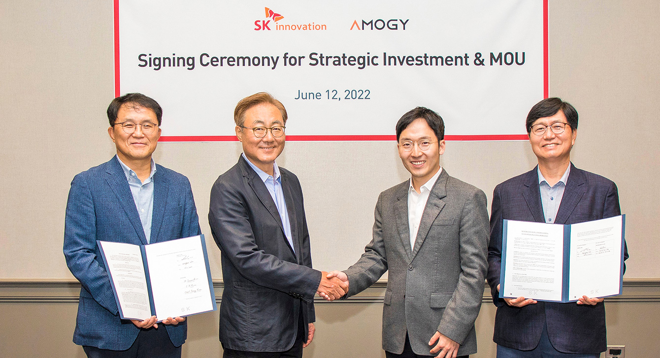 ▲ 2022년 6월, SK이노베이션이 미국 캘리포니아주 새너제이에서 암모니아 기반 연료전지 시스템 전문기업 아모지(Amogy)와 투자계약 및 기술 협력을 강화하는 내용의 양해각서(MOU)를 체결했다. (왼쪽부터) SK아이이테크놀로지 김철중 사장(당시 SK이노베이션 포트폴리오부문장), SK이노베이션 김준 부회장, Amogy 우성훈 CEO, SK이노베이션 이성준 환경과학기술원장