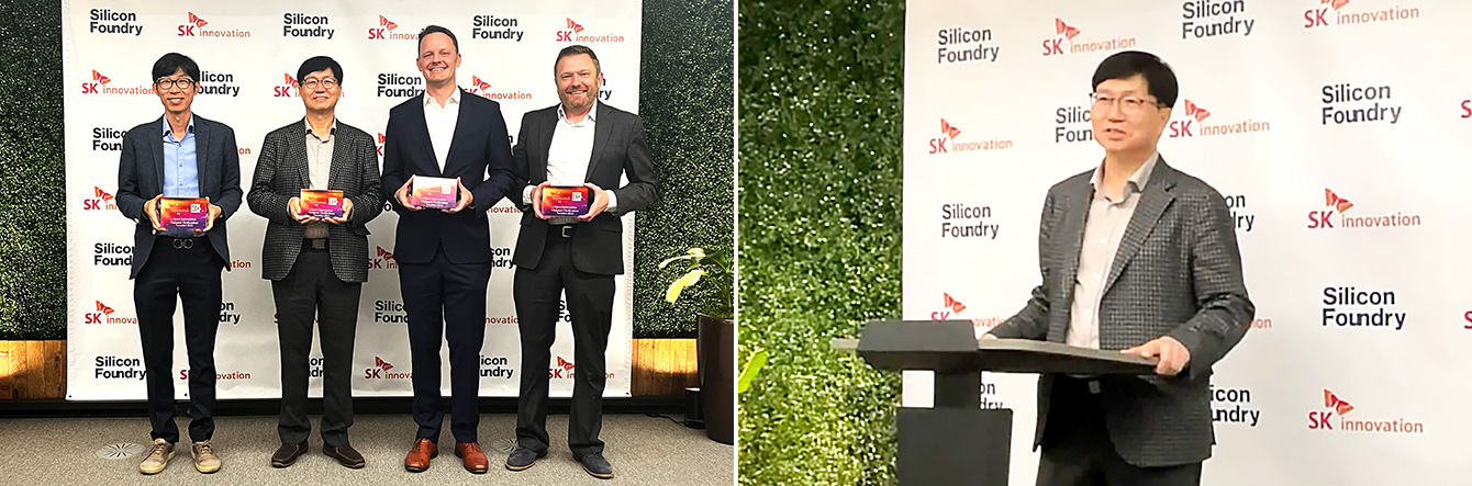 ▲ (좌) 2022년 11월, 미국 샌프란시스코 실리콘밸리에 위치한 글로벌 혁신 자문기업 실리콘 파운드리(Silicon Foundry)社의 본사에서 열린 오픈 이노베이션 포스트 개소식에 참석한 (왼쪽 두 번째부터) SK이노베이션 이성준 환경과학기술원장과 실리콘 파운드리社 닐 한쉬(Neal Hansch) CEO / (우) 오픈 이노베이션 포스트 개소식에서 이성준 원장이 인사말을 전하고 있다.