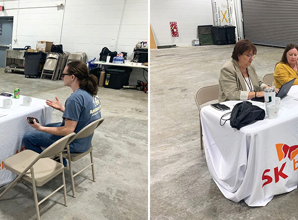 ▲ 2022년 12월, SKBA가 美 조지아주방위군 기지에서 개최된 채용박람회에 참가했다. SKBA 채용 팀이 현장을 찾은 재향군인과 면접을 진행 중이다.