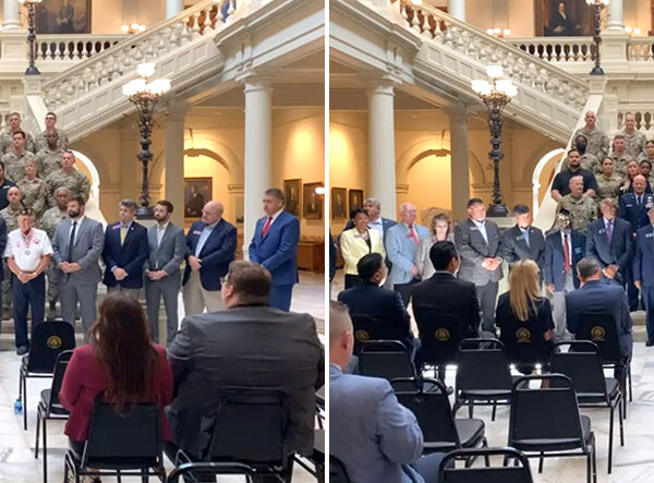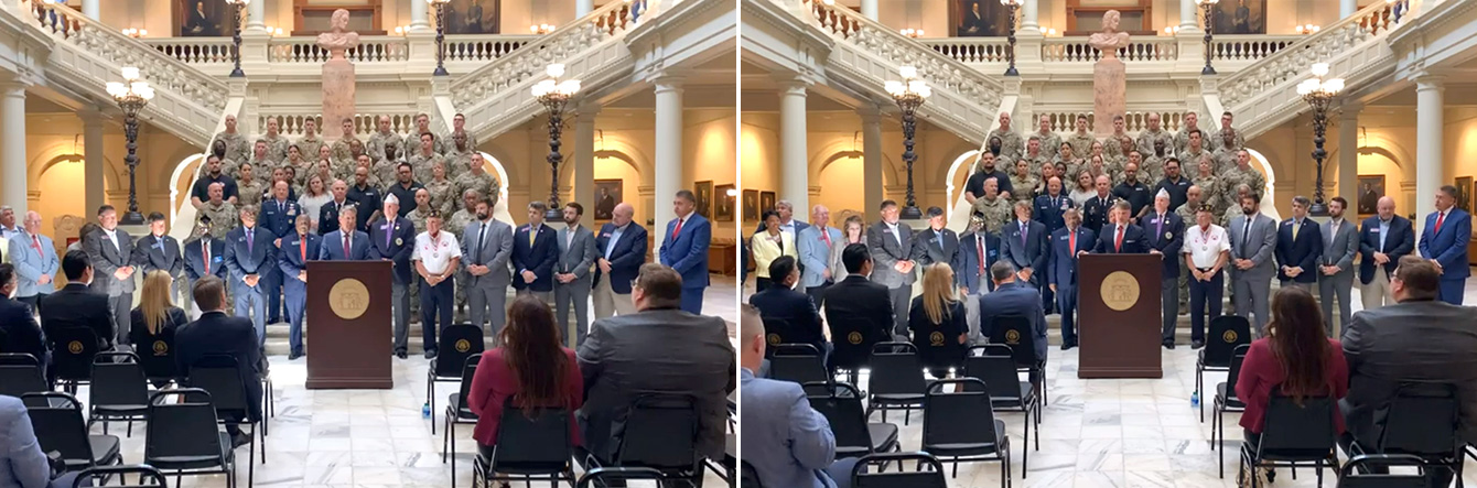 ▲ 2022년 7월, 브라이언 켐프 조지아 주지사(좌) 및 팻 윌슨 조지아주 경제개발부 장관(우)이 조지아주방위군과 SKBA의 ‘워크 포 워리어즈 조지아’ 프로그램 파트너십 체결 행사에서 축사하고 있다.