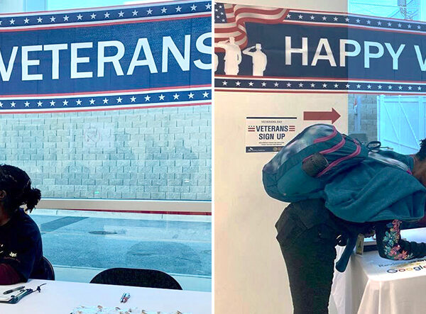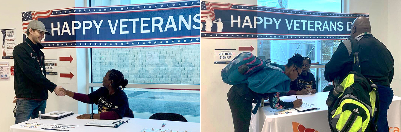 ▲ SKBA의 대외군인관계 담당인 킴벌리 딘킨스(Kimberly Dinkins, 좌측 사진 중 오른쪽)가 2022년 11월 ‘재향군인의 날’을 기념해 재향군인들에게 기념품을 나눠주며 이들의 노고에 감사를 전하고 있다.