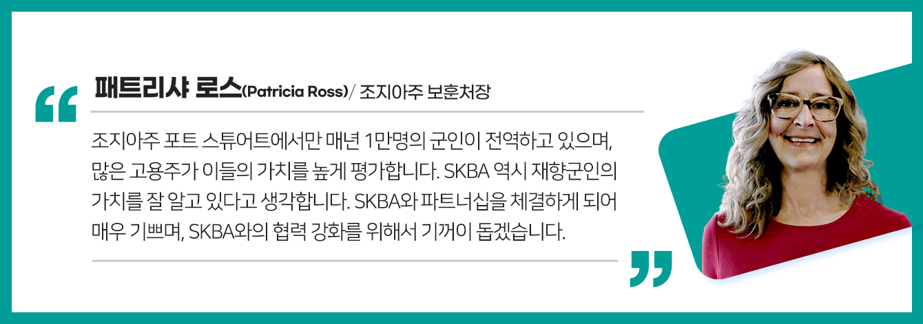 직업군인 제도를 가진 미국의 경우, 전역 후 민간에 대한 경험이 전무한 상황에서 만족할 수 있는 새로운 직업을 찾기 어렵다는 사회적 문제가 발생한다. 이를 해결하기 위해 SKBA는 고성장 산업(Fast-growing industry), 경쟁력 있는 임금(competitive wage), 고숙련 직업(high-skilled job) 등 매력적인 커리어를 제시하며 재향군인을 대상으로 취업 기회를 제공 중이다. 특히, SKBA와 ‘워크 포 워리어즈 조지아’의 협력은 재향군인을 위한 의미 있는 대표적 행보다.