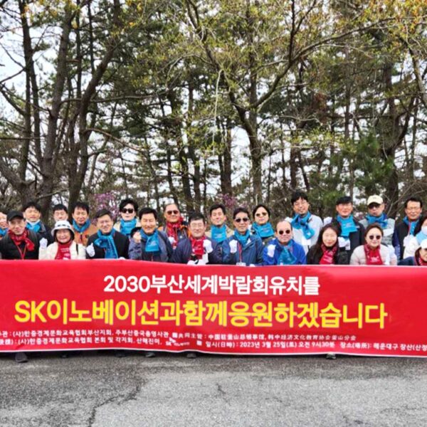 ▲ 3월 25일, 2023 한중 한마음 걷기대회에서 산해진미 활동 참여자들이 2030 부산세계박람회 유치를 응원하고 있다.