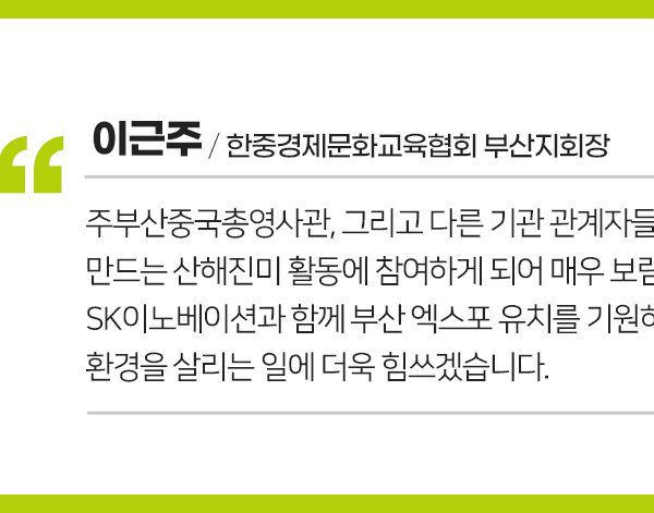 이날 산해진미에 참여한 봉사자들은 2030 부산세계박람회 유치를 위해 SK이노베이션과 함께 응원하겠다는 의지를 담아 메시지를 전하기도 했다. 한·중 교류의 중심에 선 기관들이 대한민국의 위대한 도전을 공감하고 응원의 목소리를 더한 것이다.