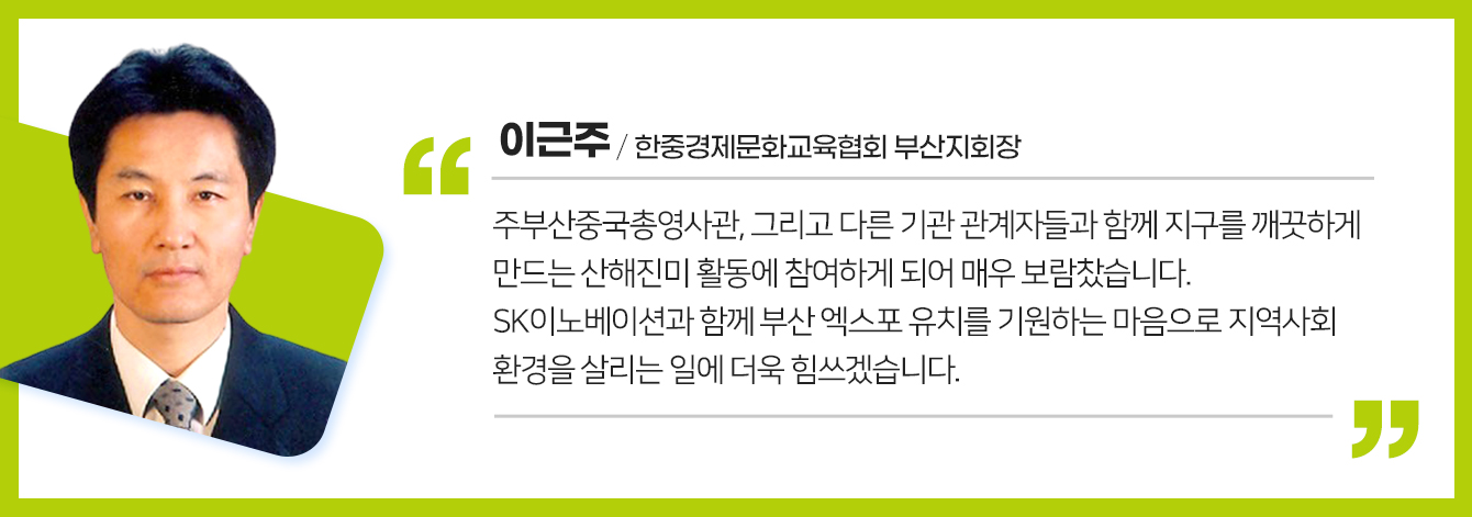 지난 3월 25일, (사)한중경제문화교육협회(이하 KCCEA)는 주부산중국총영사관 및 가족(관련기관)과 함께 지구를 지키고 친환경 가치를 전파하기 위한 산해진미(山海眞美) 활동을 전개했다. KCCEA는 한·중 비즈니스 등 교류 지원, 인재발굴 및 육성, 그리고 사회봉사 등의 사업을 영위하는 단체다. 국내외 여러 지회를 운영하며 사업 가치를 확대해 나가고 있다. 지난해 7월 한중(韓中)수교 30주년을 기념해, SK이노베이션과 KCCEA는 탄소중립 사회 실현과 친환경 가치 전파를 위한 산해진미 캠페인 협력을 약속한 바 있다. 이번 활동은 그 약속을 지속해서 지켜 나가겠다는 실천의지의 일환이다.