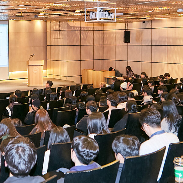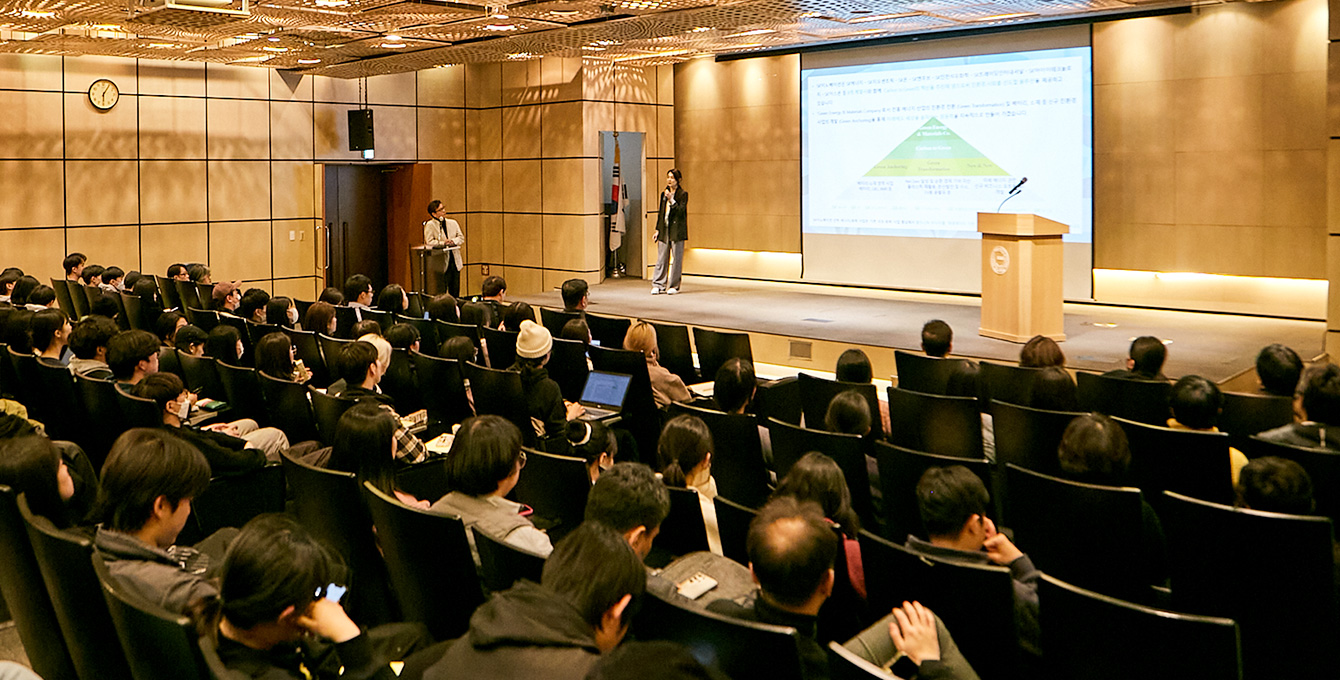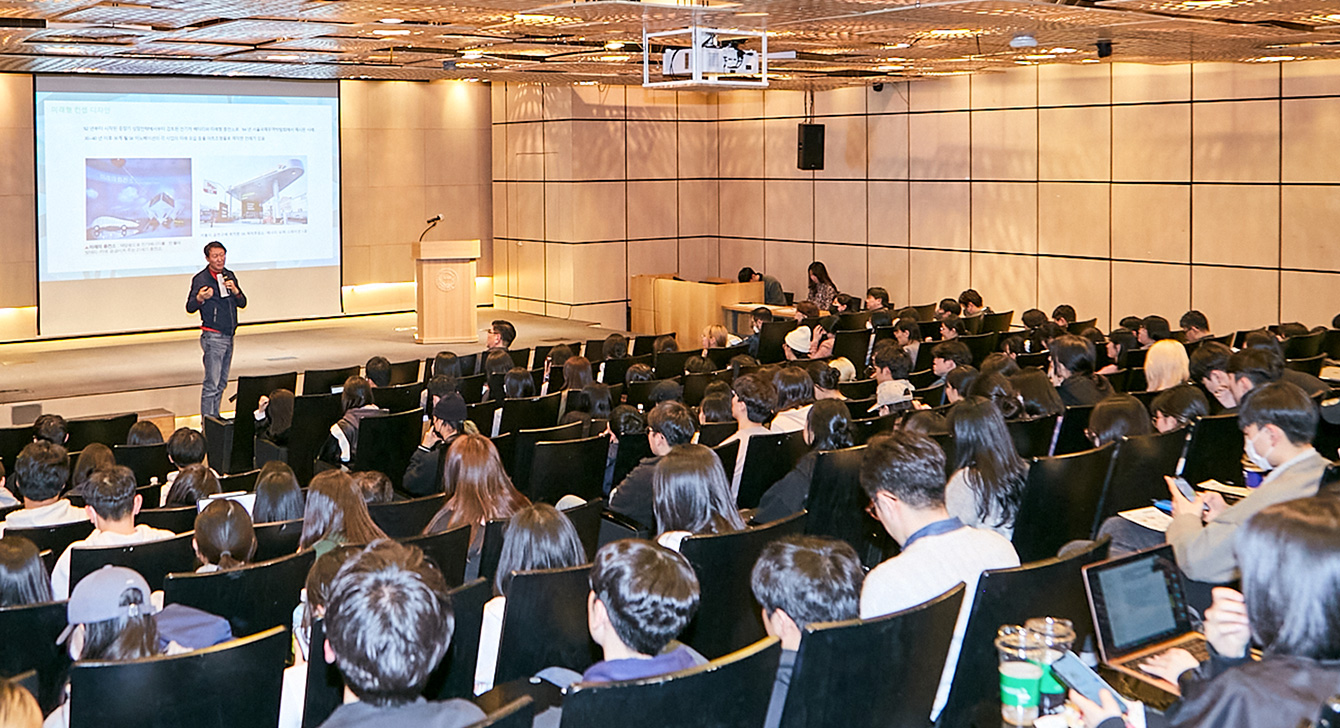 ▲ 3월 29일, SK이노베이션이 국민대학교 본부관 학술회장에서 ‘행복Green디자인’ 학생설명회를 개최했다. 국민대학교 디자인계열 전공 학생들이 SK이노베이션 임수길 밸류크리에이션센터장으로부터 ‘행복Green디자인’ 프로젝트 관련 설명을 듣고 있다.
