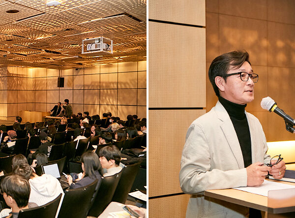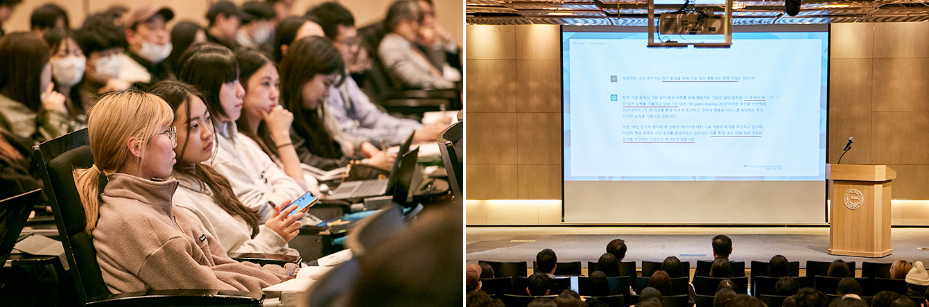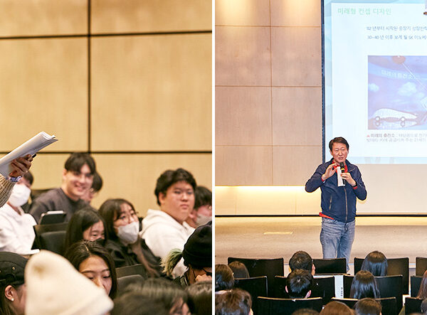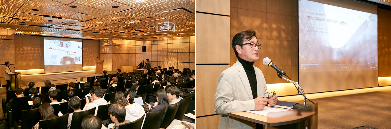 ▲ (좌) ‘행복Green디자인’ 학생설명회에서 국민대학교 디자인계열 전공 학생들이 SK이노베이션 계열의 홍보영화를 시청 중이다. / (우) 국민대학교 김민 테크노디자인전문대학원장이 ‘행복Green디자인’ 전시 기획안을 소개하고 있다.