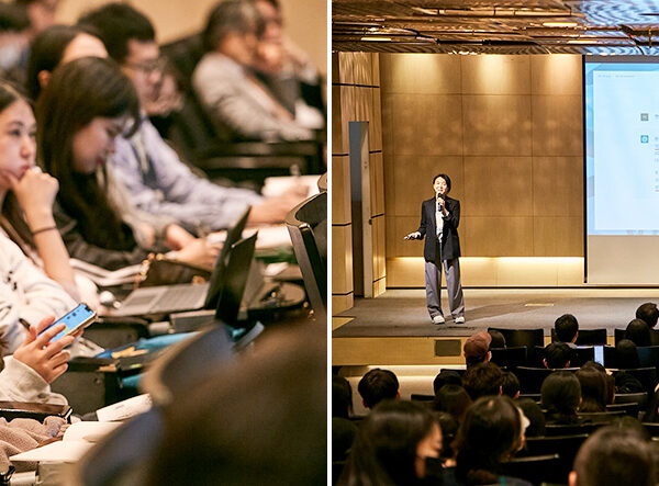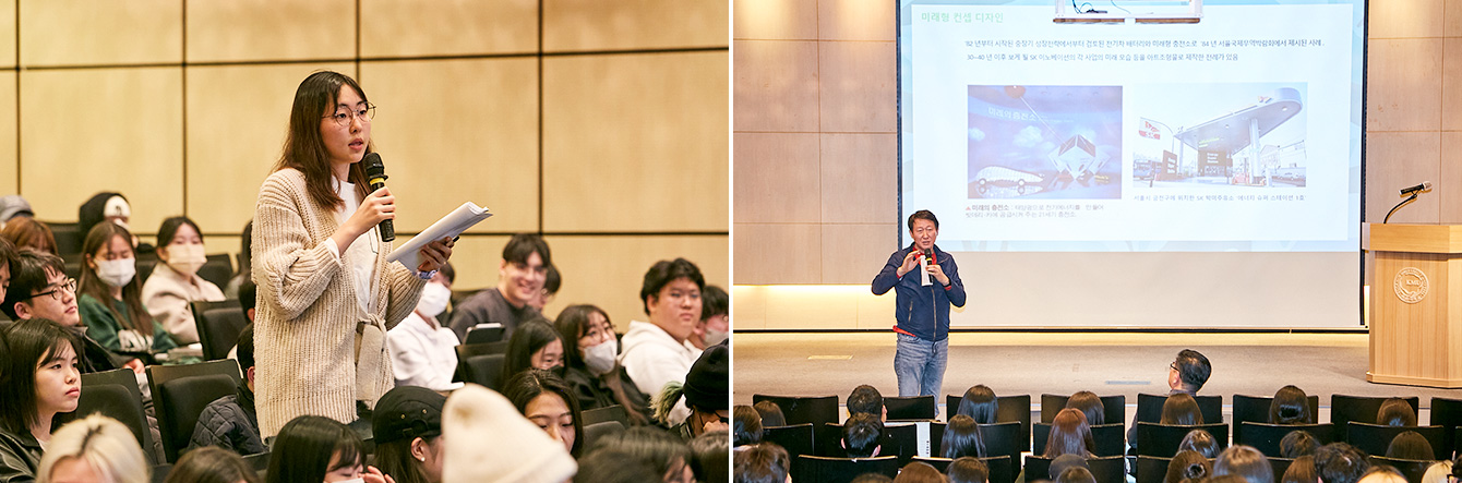 ▲ (좌) ‘행복Green디자인’ 학생설명회에 참석한 국민대학교 디자인계열 전공 학생이 프로젝트와 관련한 질문을 하고 있다. / (우) SK이노베이션 밸류크리에이션 임수길 센터장이 학생들의 질문에 답변 중이다.