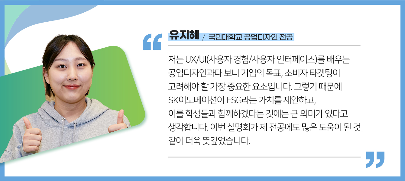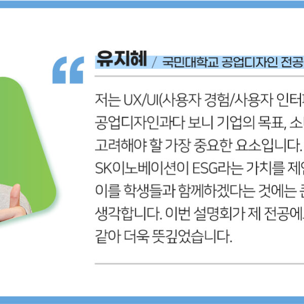 이날 설명회에서는 최근 화제의 중심인 챗GPT를 활용해 SK이노베이션과 국민대학교 디자인계열을 학생들에게 소개해 눈길을 끌었다. 챗GPT에서 직접 검색해 본 결과, SK이노베이션과 국민대학교 디자인계열은 ‘국내 최고’라는 공통점이 도출됐고 이에 현장 분위기는 더욱 밝아졌다.