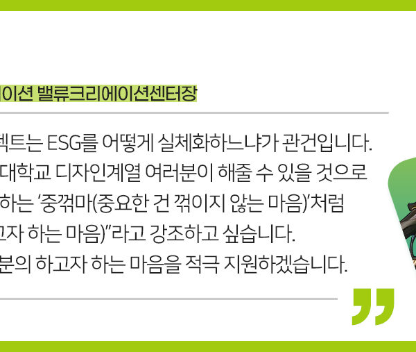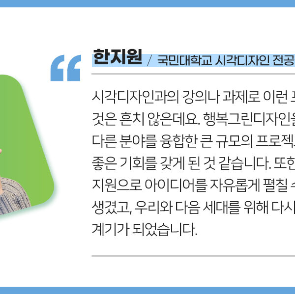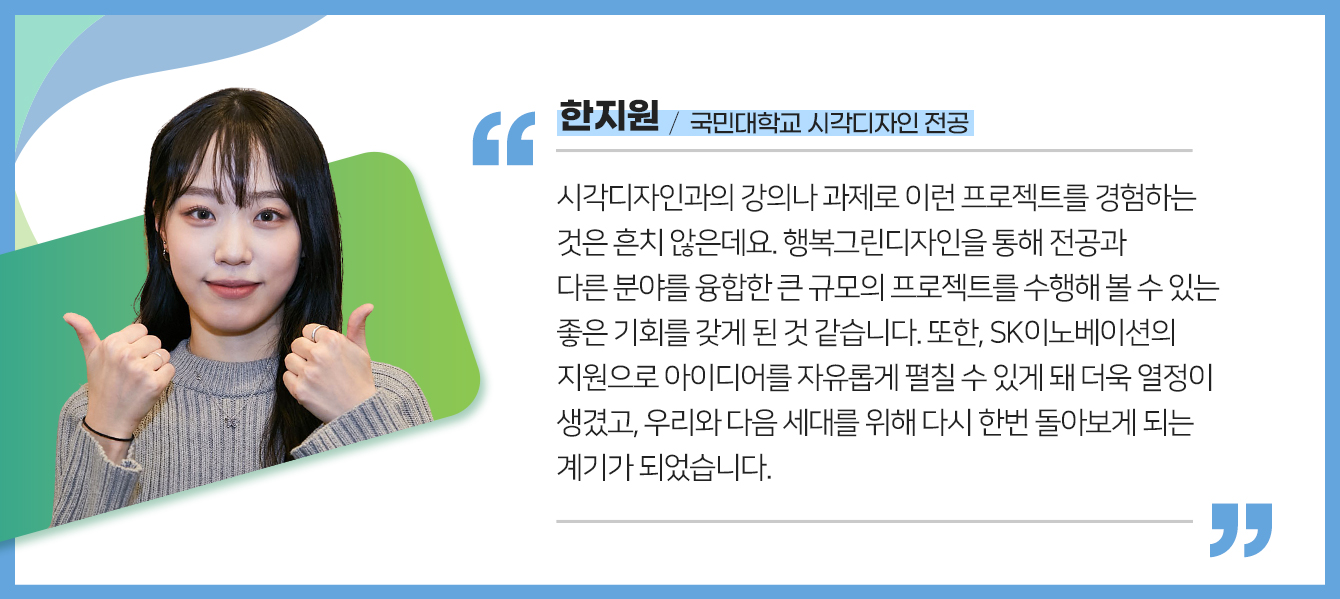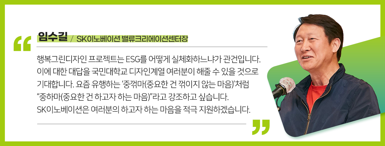 ESG 경영 및 넷제로(Net Zero)를 향한 SK이노베이션의 노력을 예술 및 디자인을 통해 소통하는 ‘행복Green디자인(이하 행복그린디자인)’ 프로젝트가 국민대학교 학생들과 함께 본격적인 시작을 알렸다.