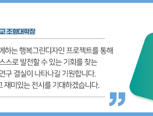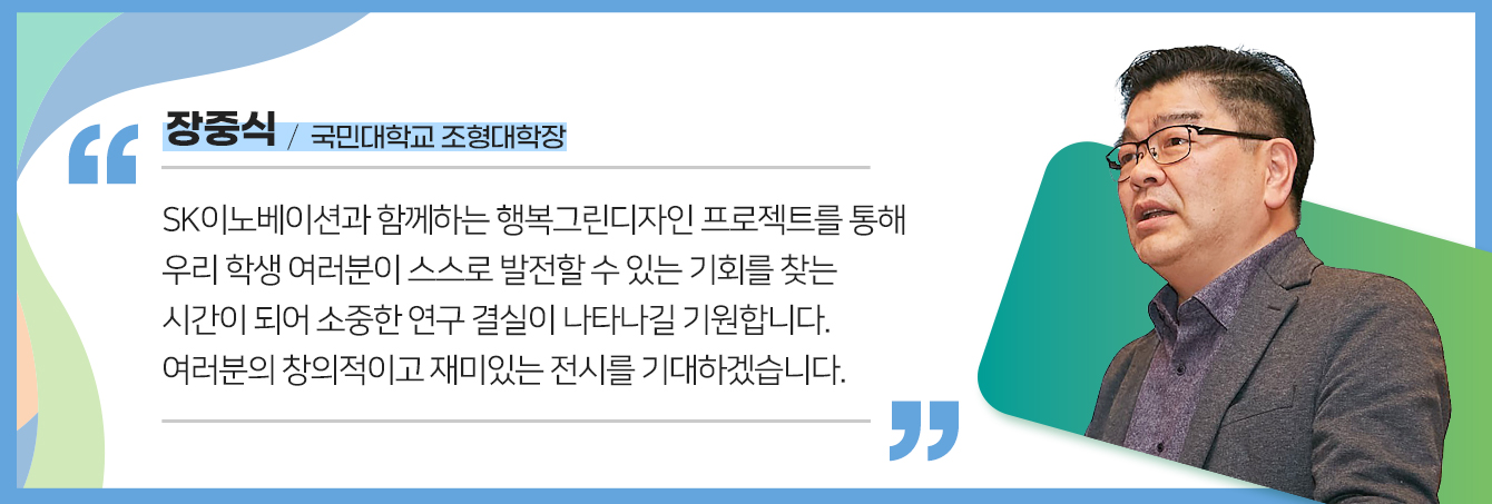 이후 국민대학교 김민 테크노디자인전문대학원장의 행복그린디자인 전시 기획안 소개에 이어, 국민대학교 장중식 조형대학장과 SK이노베이션 임수길 밸류크리에이션센터장이 학생들에게 각각 인사말을 전했다.