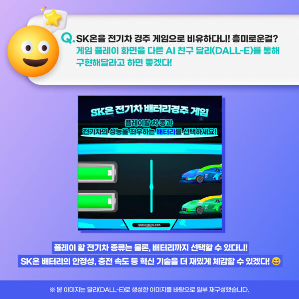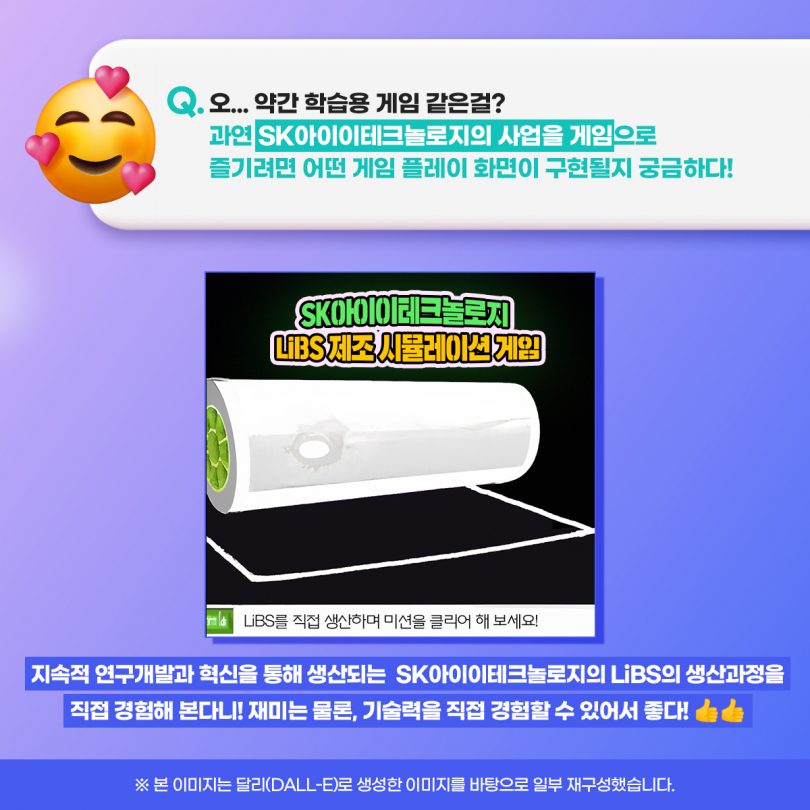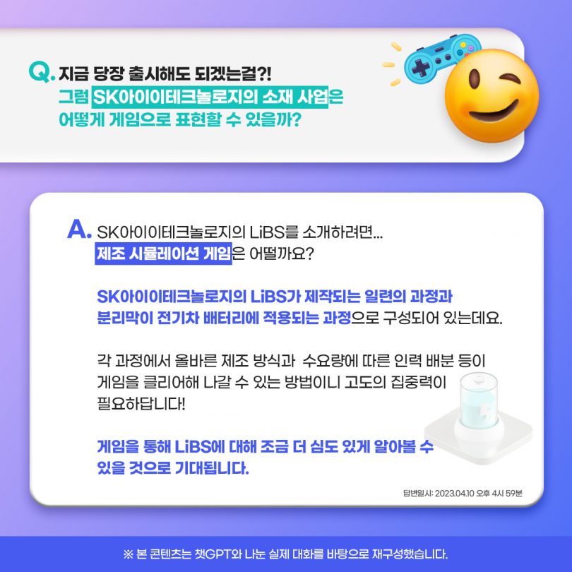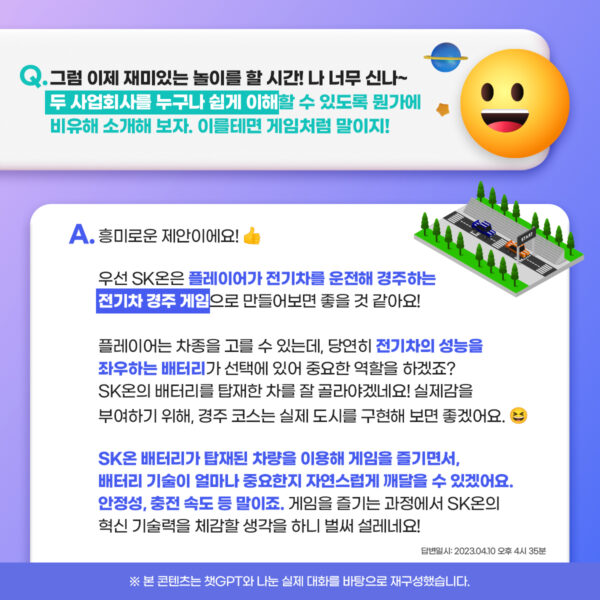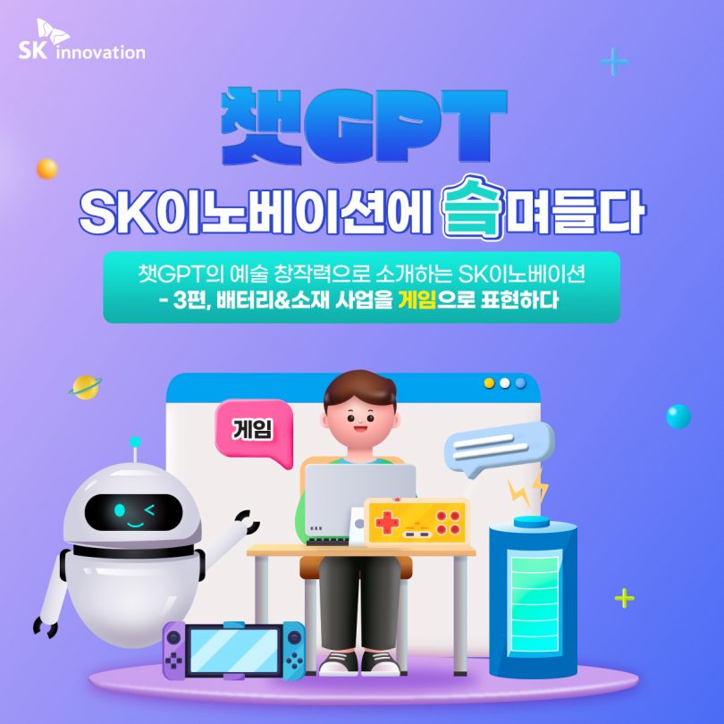또한, 챗GPT와 함께 SK온과 SK아이이테크놀로지의 사업과 기술력을 누구나 쉽고 재밌게 접할 수 있는 가상 게임으로 비유해 봤다. 과연, 챗GPT가 만든 게임은 얼마나 흥미로울까? 지금부터 챗GPT와 함께 SK이노베이션에 ‘슼’며들어 보자!