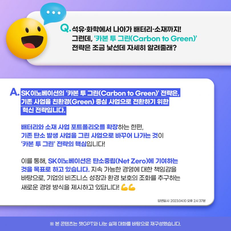 세 번째 편으로 챗GPT를 통해 SK이노베이션의 ‘카본 투 그린(Carbon to Green)’ 전략을 소개하고, 그중에서도 배터리&소재 사업을 담당하고 있는 SK온과 SK아이이테크놀로지에 대해 심도 있게 알아봤다.