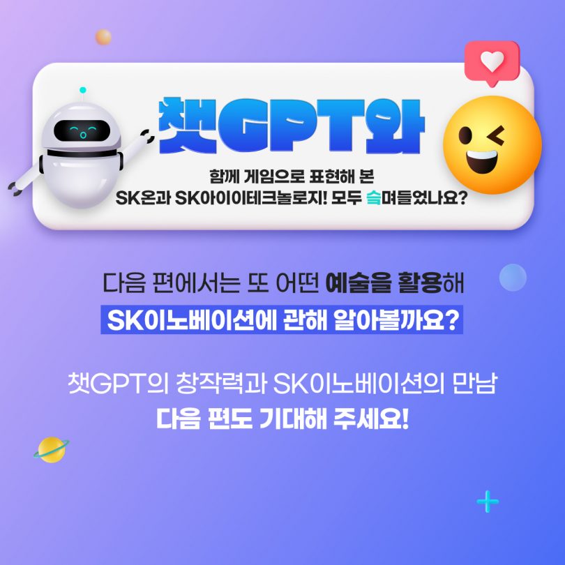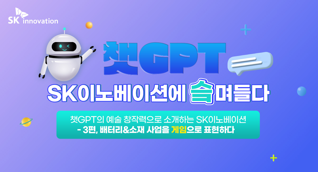 챗GPT는 SK이노베이션 계열에 관해 얼마나 알고 있을까? 이런 호기심으로 척척박사 챗GPT에게 SK이노베이션 계열에 관한 다양한 질문을 던져 본다. 그리고 챗GPT의 창작 능력을 십분 활용해, 답변 내용을 노래, 소설, 게임 등 다양한 예술·문화 콘텐츠로 구현해 봤다.