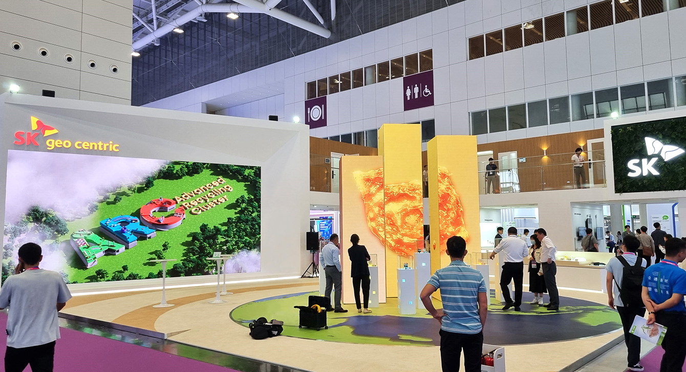 SK지오센트릭은 2021년, 지구와 토양을 뜻하는 ‘Geo’와 중심을 뜻하는 ‘Centric’을 조합한 새로운 사명을 공표했다. 지구 환경을 최우선으로 생각하며, 폐플라스틱 오염 문제를 해결하고자 하는 강력한 의지를 표현한 것이다. 이번 ‘차이나플라스 2023’에서는 이러한 사명 변경의 의미와 친환경 비즈니스 전환 및 파이낸셜 스토리를 반영한 전시 부스를 선보였다. 사명 변경과 더불어 First Mover로서의 친환경 기업 Identity를 고도화하는 것이 목표다.