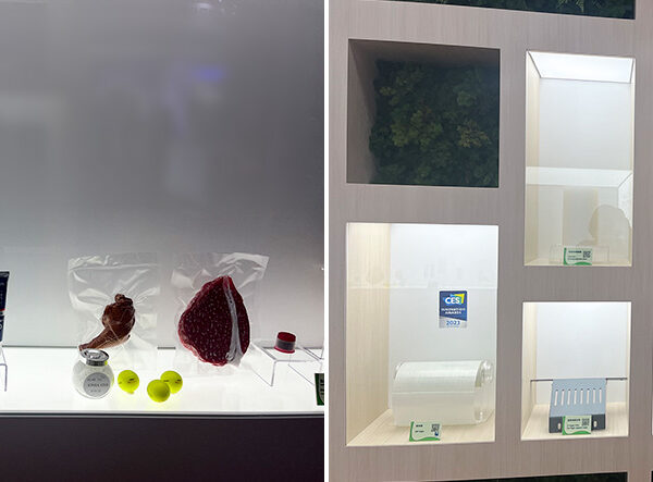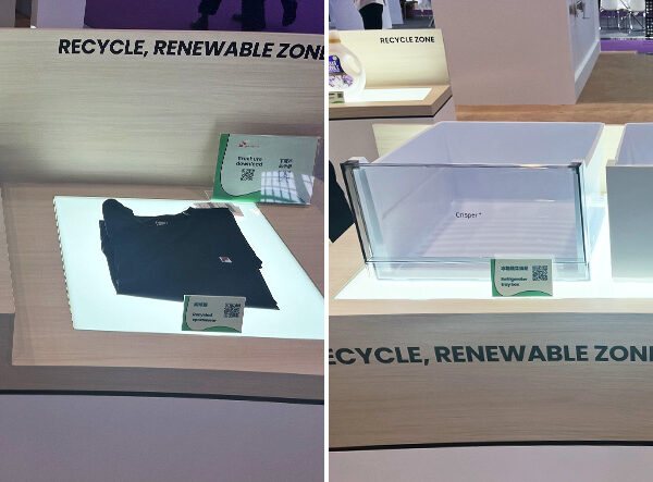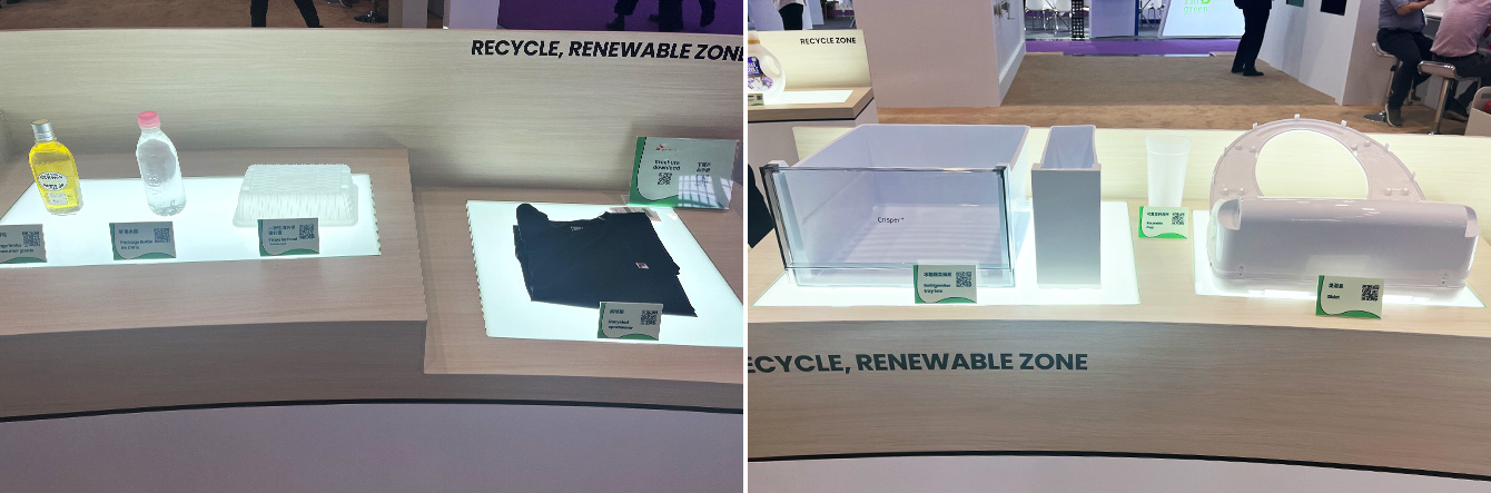 LED 타워 맞은편 ZONE 2에서는 SK지오센트릭 폐플라스틱 재활용 제품이 적용된 모습을 실물로 확인할 수 있었다. 재생 폴리에틸렌(r-PE)로 만든 비닐랩, 가방, 섬유유연제, 재생 PET로 제작된 테니스복과 물병, 그리고 재생 폴리프로필렌(r-PP)으로 만들어진 냉장고용 야채박스 등이 전시되었다. 도시에서 모이는 쓰레기들이 모여 다시 새로운 제품으로 탄생한 결과물인 셈이다.