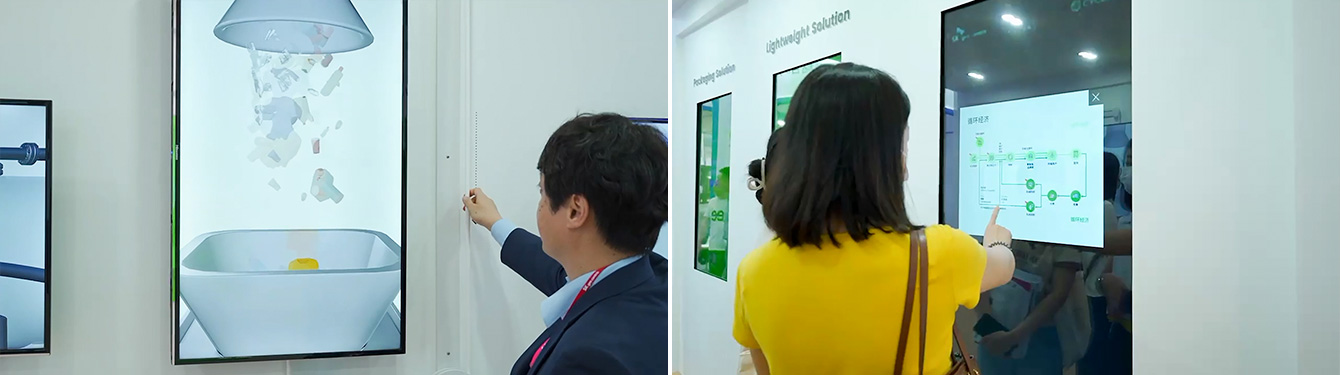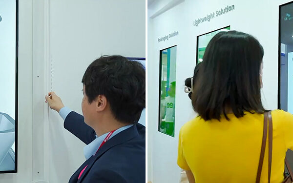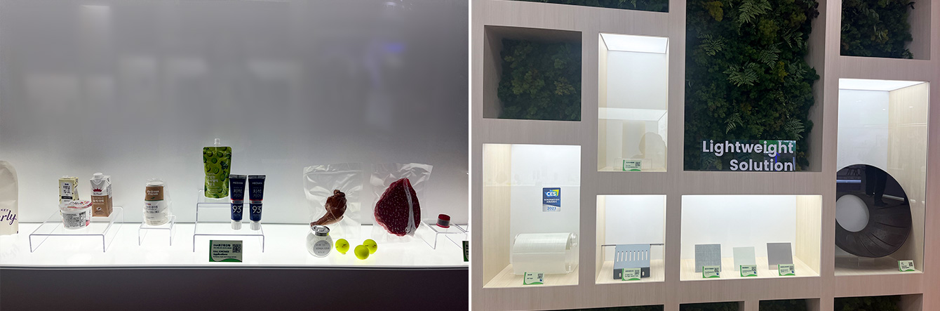 다른 벽면에는 SK지오센트릭의 패키징 제품, 경량화 제품, 리사이클 제품 등을 쉽게 볼 수 있도록 제품 브로셔를 대신한 키오스크가 배치됐다. 특히, 키오스크는 SK지오센트릭 제품들의 자세한 정보와 울산 ARC(Advanced Recycling Cluster)에 적용되는 핵심 기술을 보여주어, 다양한 업체 관계자에게 활용되었다.