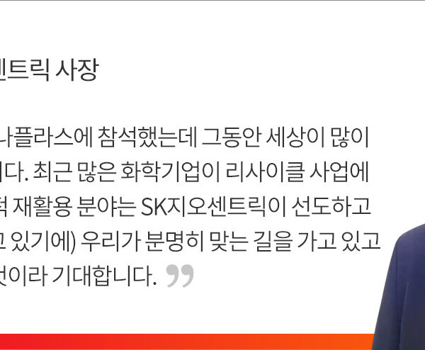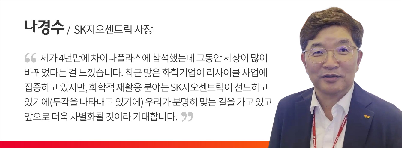 SK지오센트릭은 ‘플라스틱을 넘어선(beyond Plastic), 세상에 아직 존재하지 않는 비즈니스’를 하는 기업이 되겠다고 천명했다. ‘차이나플라스 2023’ 전시 현장은 SK지오센트릭의 이 같은 친환경 비즈니스를 세계에 알리고, 세계 최고의 리사이클링 소재 기업이라는 목표도 재확인할 수 있는 기회였다. 앞으로 SK지오센트릭의 플라스틱 재활용, 고부가 화학제품이 글로벌 시장에서 어떤 발자취를 남길 수 있을지 기대된다.