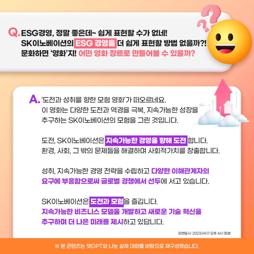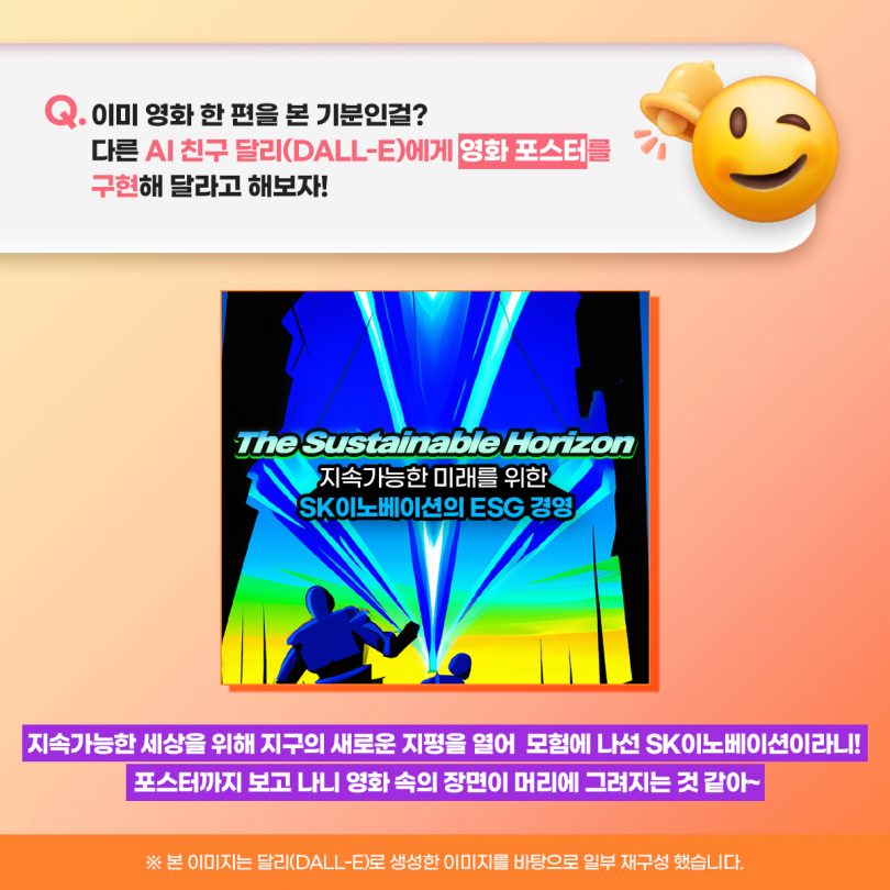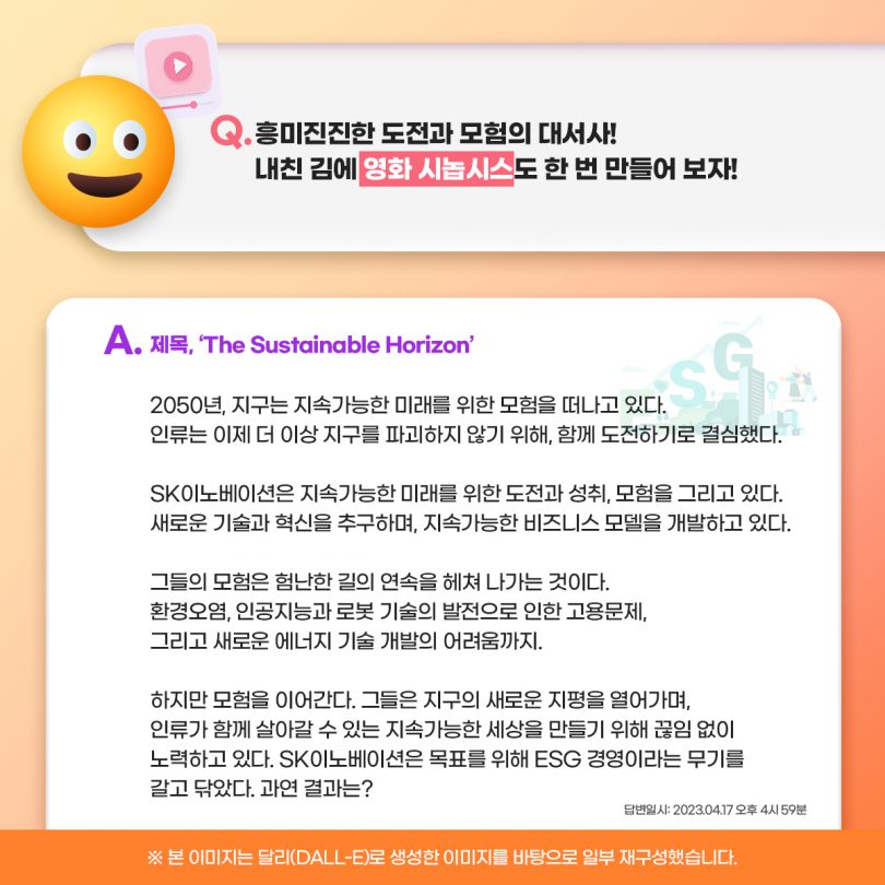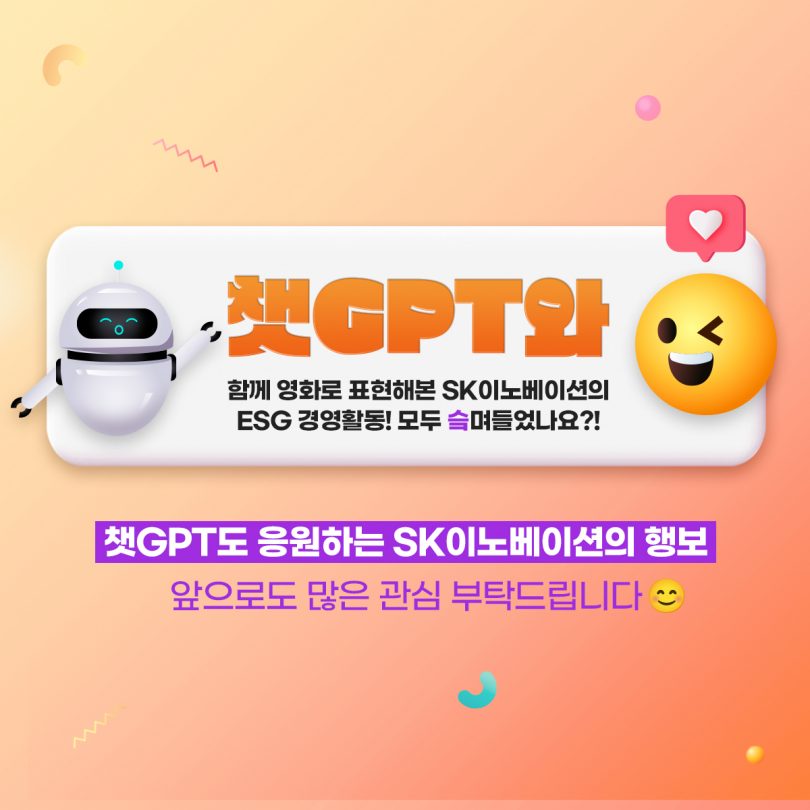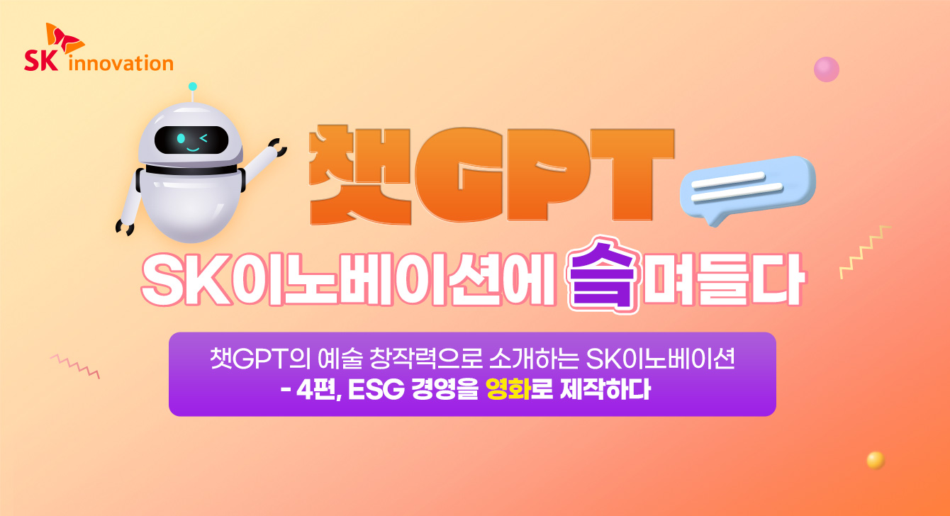 그 마지막 편으로 챗GPT와 함께 SK이노베이션이 적극적으로 시행하고 있는 ESG 경영에 대해 알아봤다. 그리고, SK이노베이션의 ESG 경영을 더욱 쉽고 재밌게 표현하기 위해 챗GPT와 함께 영화로 표현해 봤다. 챗GPT가 작성한 SK이노베이션의 ESG 경영을 담은 영화 시놉시스는 어떤 내용일까? 지금부터 챗GPT와 함께 SK이노베이션에 ‘슼’며들어 보자!