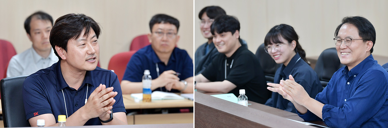 ▲ (상단) SK아이이테크놀로지 김철중 사장(앞줄 오른쪽에서 네 번째)이 증평 공장을 방문해 품질경영실 구성원들과 기념사진을 촬영하고 있다. / (하단) 김철중 사장과 품질경영실 구성원들이 간담회 시간을 가지고있다.