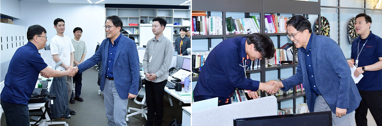 ▲ SK아이이테크놀로지 김철중 사장이 증평 공장 공유오피스를 찾아 구성원들과 인사를 나누고 있다.