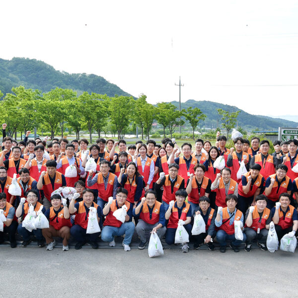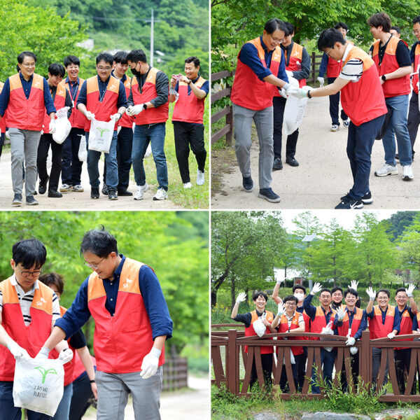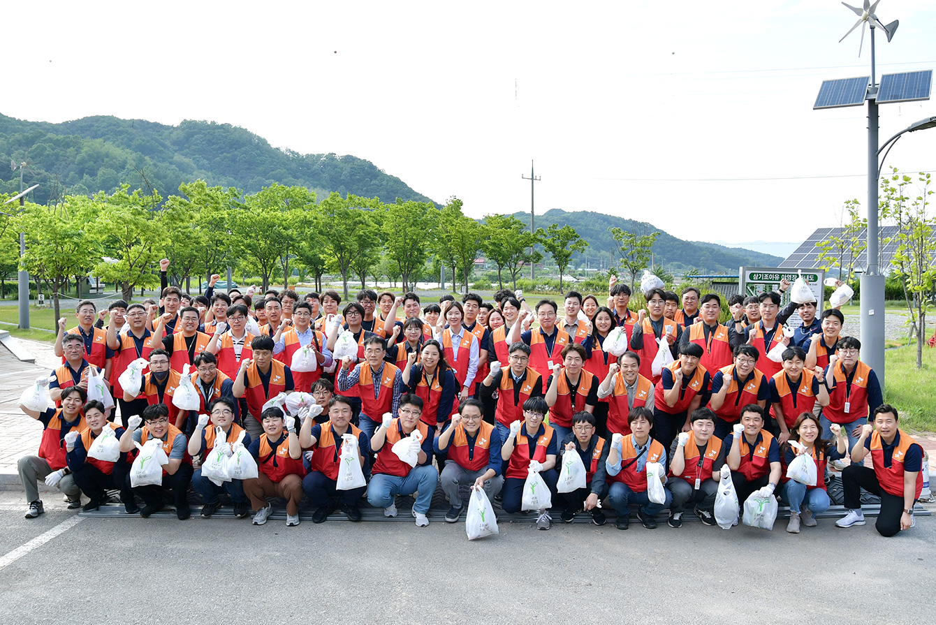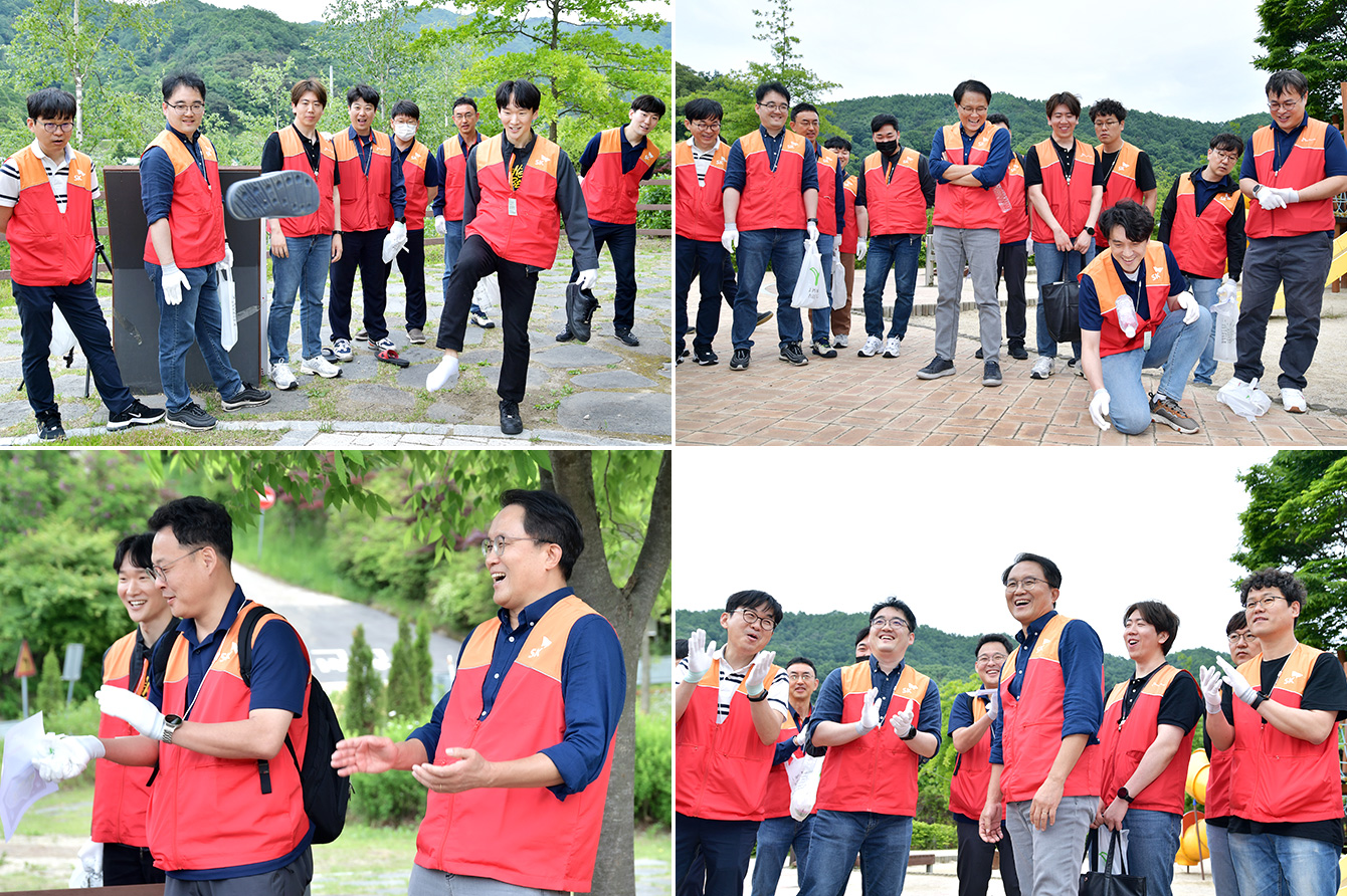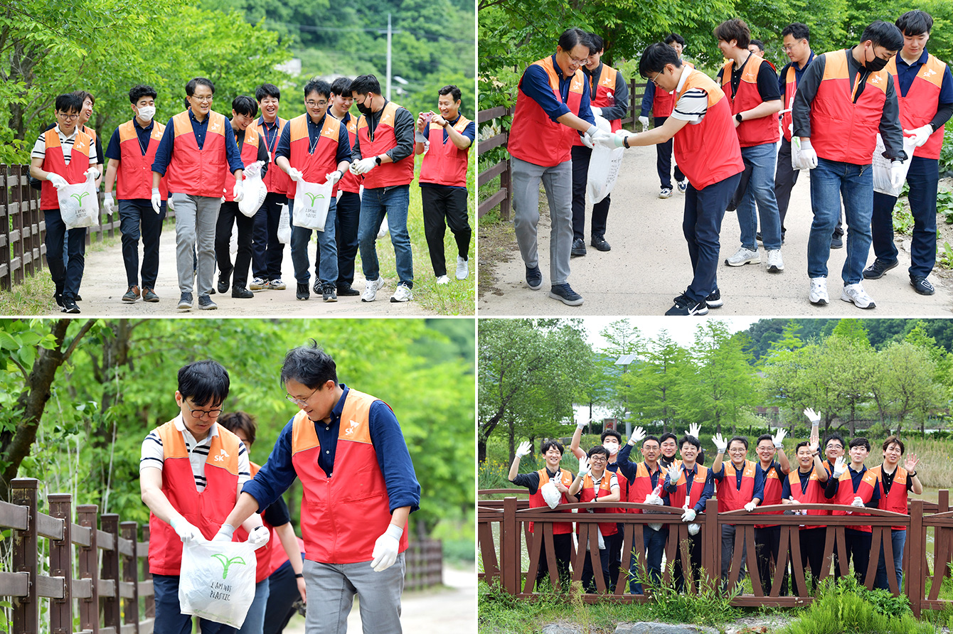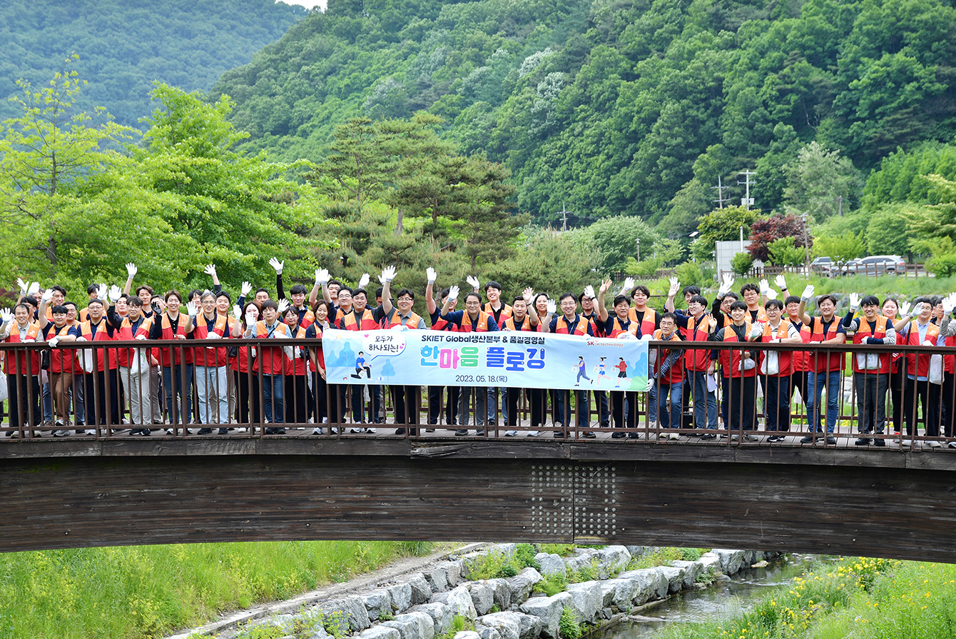 ▲ 5월 18일, SK아이이테크놀로지 김철중 사장과 Global생산본부 & 품질경영실 구성원들이 충북 증평군 삼기저수지 등잔길 인근에서 ‘한마음 플로깅’을 진행했다.