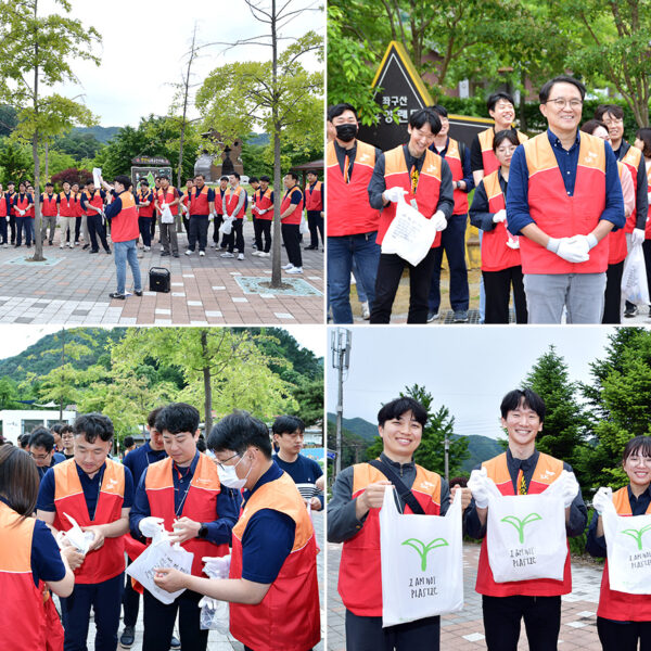 ▲ (상단 좌측부터 시계 방향으로) SK아이이테크놀로지 김철중 사장과 구성원들이 플로깅 진행 전 안전교육을 진행하고 있다. / 김철중 사장이 구성원들과 함께 안전교육을 듣고 있다. / 구성원들이 플로깅에 앞서 준비물을 전달받고, 조를 편성해 기념사진을 촬영하고 있다. / 구성원들이 플로깅 준비물을 전달받고 있다.