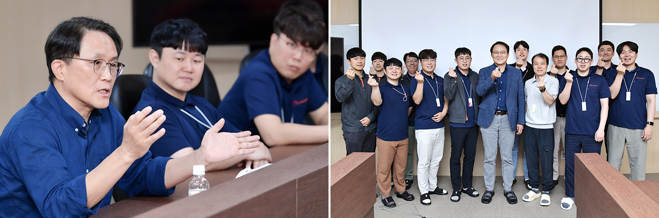 ▲ (좌) SK아이이테크놀로지 김철중 사장이 증평 공장 구성원들과의 간담회 자리에서 구성원들의 질문에 답변하고 있다. / (우) SK아이이테크놀로지 김철중 사장과 증평 공장 구성원들이 간담회 후 기념 사진을 촬영하고 있다.
