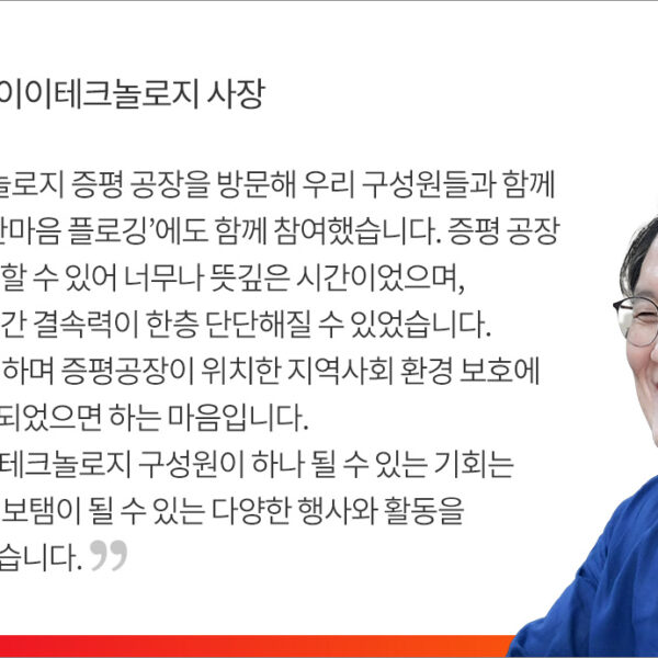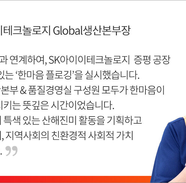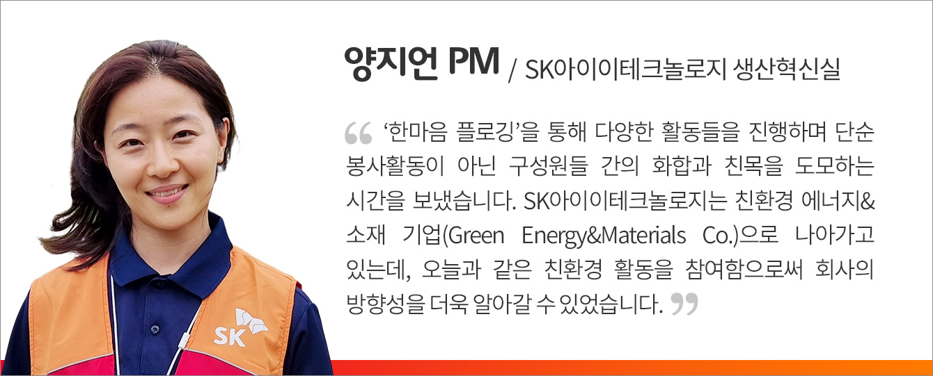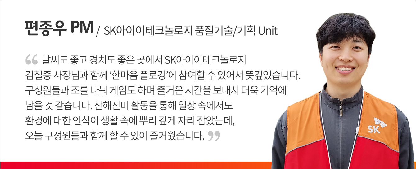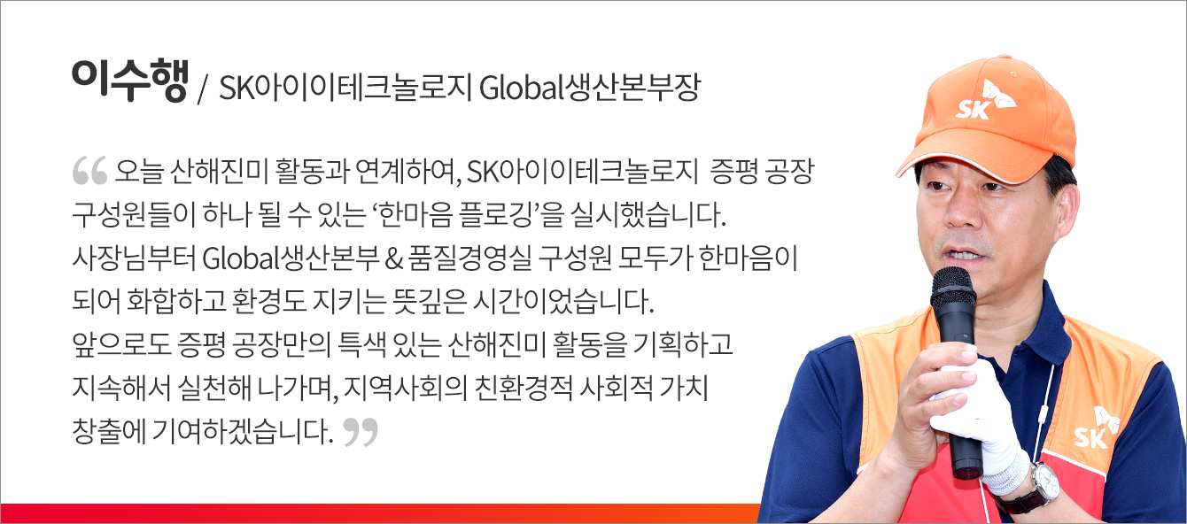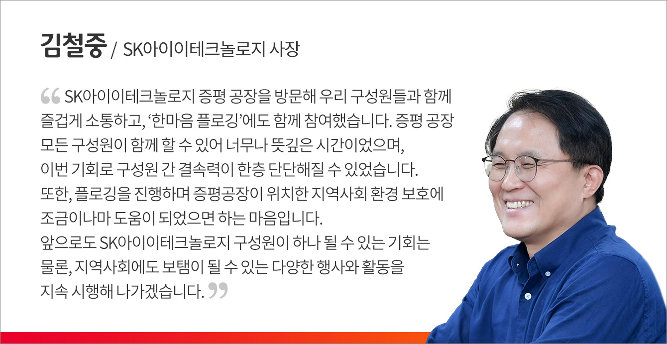 SK아이이테크놀로지 김철중 사장이 충북 소재 증평 공장을 방문해 소통과 화합의 시간을 가졌다. 지난 5월 18일 증평 공장에 방문한 김철중 사장은 구성원들을 격려하고 공장 현안에 관해 점검했다. 이후 구성원들과 함께 산해진미(山海眞美)* 활동의 일환으로 ‘한마음 플로깅’을 진행하며, 화합과 소통의 시간을 가졌다. 특히, 이번 산해진미 활동은 특별한 프로그램으로 구성되어, SK아이이테크놀로지만의 활기찬 문화를 엿볼 수 있었다.
