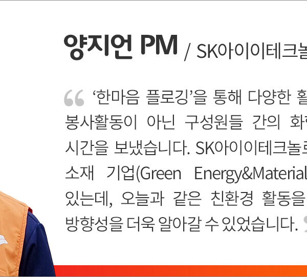 이번 SK아이이테크놀로지의 산해진미는 구성원 간 화합을 도모할 수 있는 야외 활동 및 게임이 함께 진행됐다는 점에서 특별함이 더해진다. SK아이이테크놀로지 이수행 Global생산본부장의 안전교육을 시작으로, 본격적인 ‘한마음 플로깅’이 시작됐다. 구성원들은 봉투와 장갑 등 활동을 위한 장비를 수령하고, 6개 조로 나뉘어 게임과 플로깅에 참여했다.