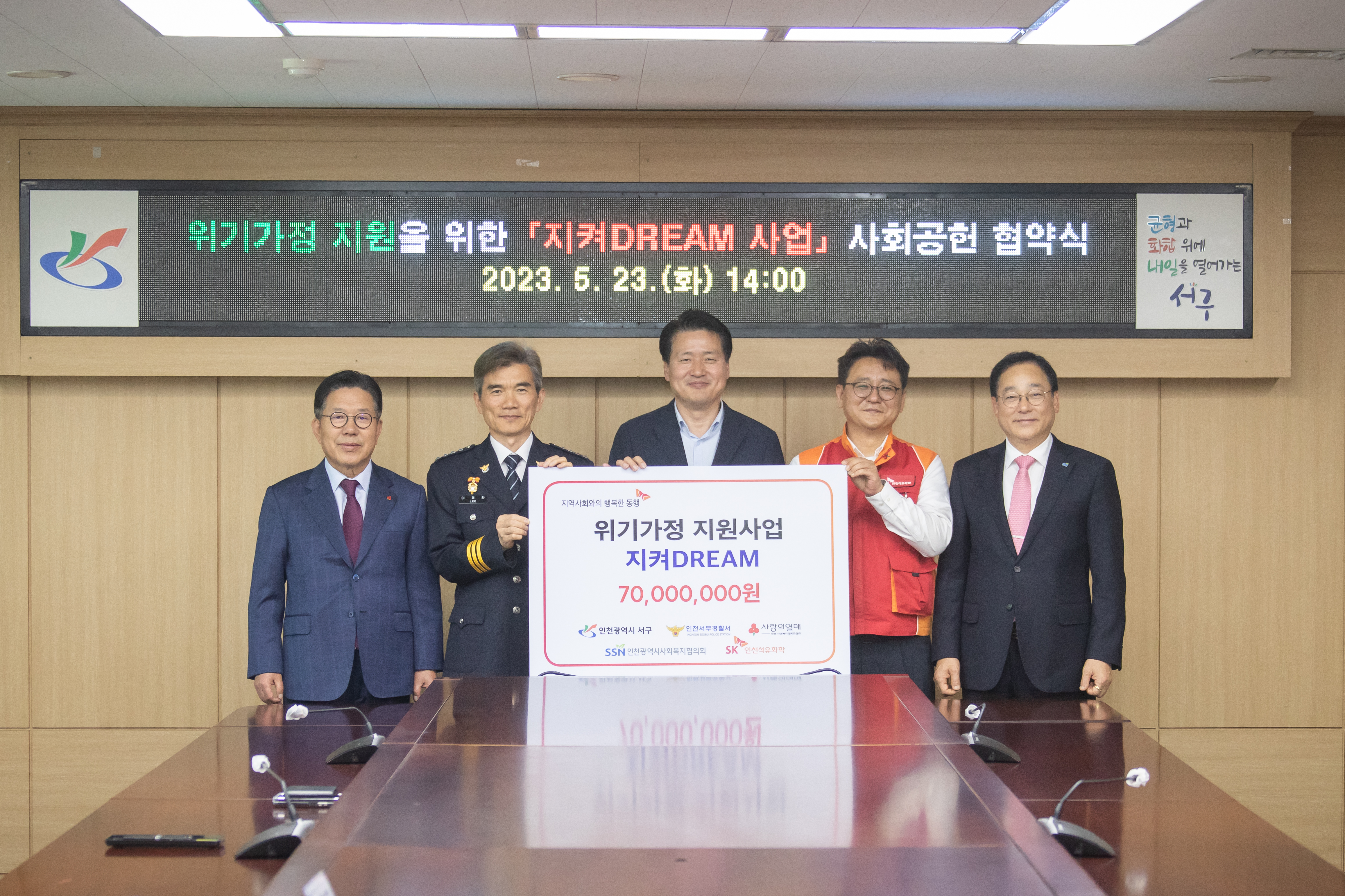 SK인천석유화학은 지난 23일 인천광역시 서구청에서 강범석 인천 서구청장과 이재환 인천서부경찰서장, 조상범 인천사회복지공동모금회장, 박선원 인천사회복지협의회장, SK인천석유화학 홍욱표 경영혁신실장 등이 참석한 가운데 ‘지켜 DREAM’ 기부금 전달식을 개최하고, 7천만원을 기부했다.