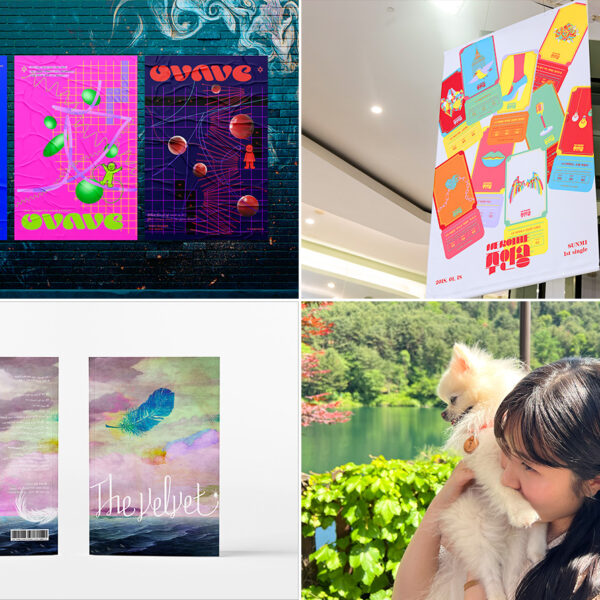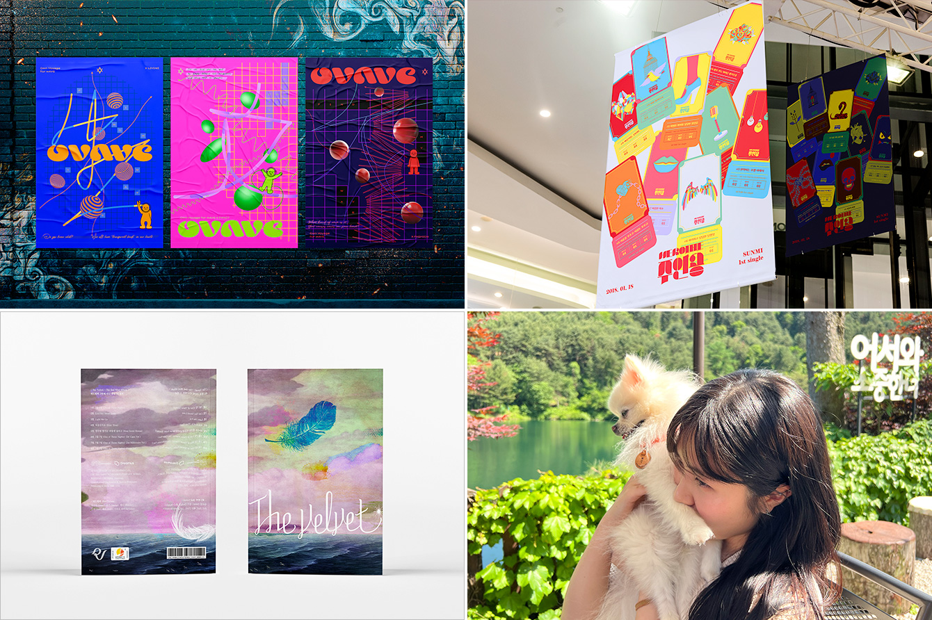 ▲ (좌측 상단부터 시계방향으로) 이새빈 학생의 자체 제작 브랜드 <OVAVE> 아이덴티티 포스터 (2021) / 이새빈 학생이 작업한 선미 <주인공> 프로모션 포스터 (2020) / 이새빈 학생과 사랑스러운 반려견 강이의 즐거운 한때 / 이새빈 학생이 작업한 레드벨벳 <The Velvet> 음반 디자인 중 일부 (2022)