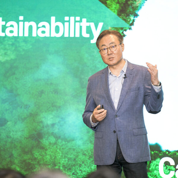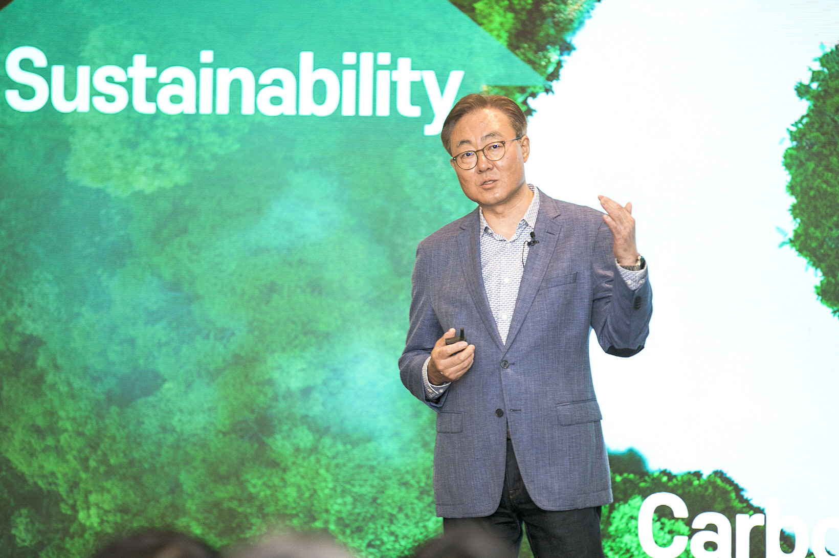 [사진 설명] 지난해 6월, SK이노베이션 김준 부회장이 미국 캘리포니아주 샌프란시스코만 남부에 위치한 새너제이에서 열린 ‘SK이노베이션 글로벌 포럼’ 기조연설에서 SK이노베이션의 그린 포트폴리오(Green Portfolio) 구축 방향과 사업모델 혁신 의지를 소개하고 있다.