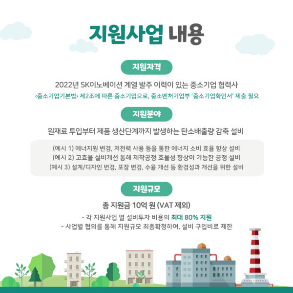 국제사회는 전 세계에서 나타나는 기후변화로 인한 자연재해 및 이상기후 현상을 해결하고자 지구온도 상승을 1.5℃ 이내로 억제하자는 목표를 세웠다. 이를 위해선 2050년까지 탄소중립 사회로의 전환이 필수며, 탄소중립은 더 이상 거스를 수 없는 세계적 흐름이다. SK이노베이션 계열과 함께하는 협력사라면, 이번 지원사업을 통해 탄소저감 설비를 도입하고 글로벌 탄소 감축 노력에 동참해보자.