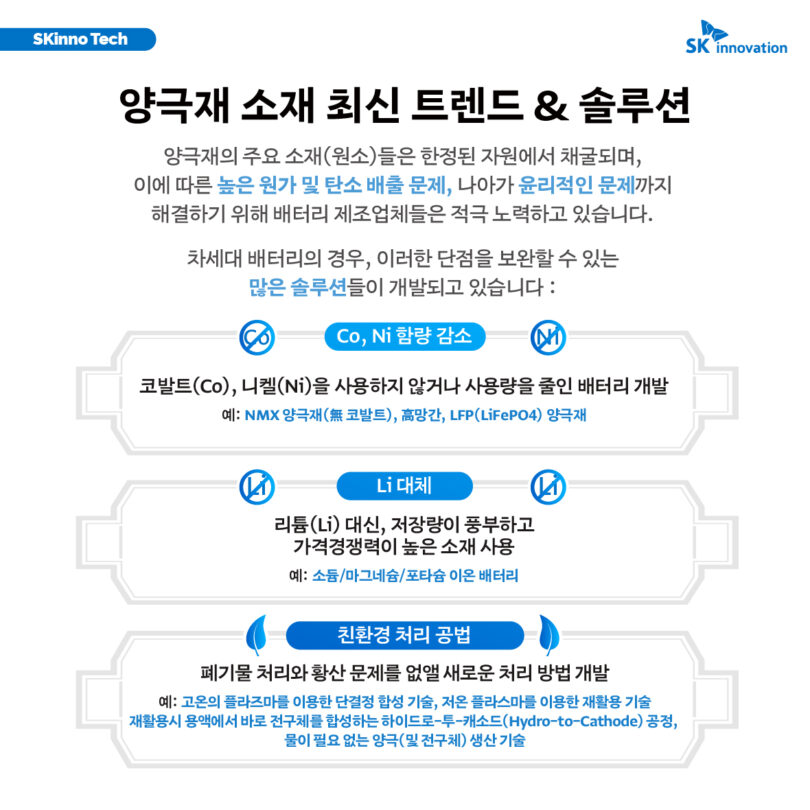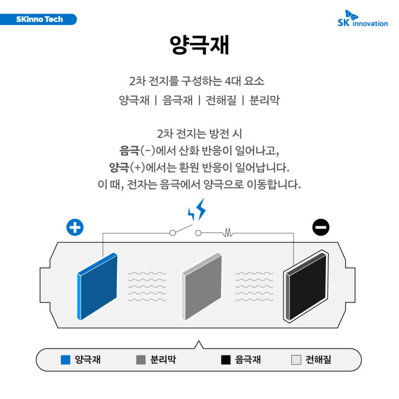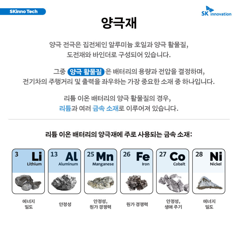 이번 편에서는 2차 전지의 배터리 용량 및 전압을 결정하고, 전기차의 주행거리와 출력을 좌우할 정도로 중요한 ‘양극재’에 대해 알아본다. 양극재의 구조 및 종류, 양극재 소재에 관한 최신 트렌드와 솔루션부터 SK온의 양극재 소재 확보 노력까지, ‘SKinno Tech’ 시리즈 ‘양극재’ 편을 통해 자세히 확인해보자.