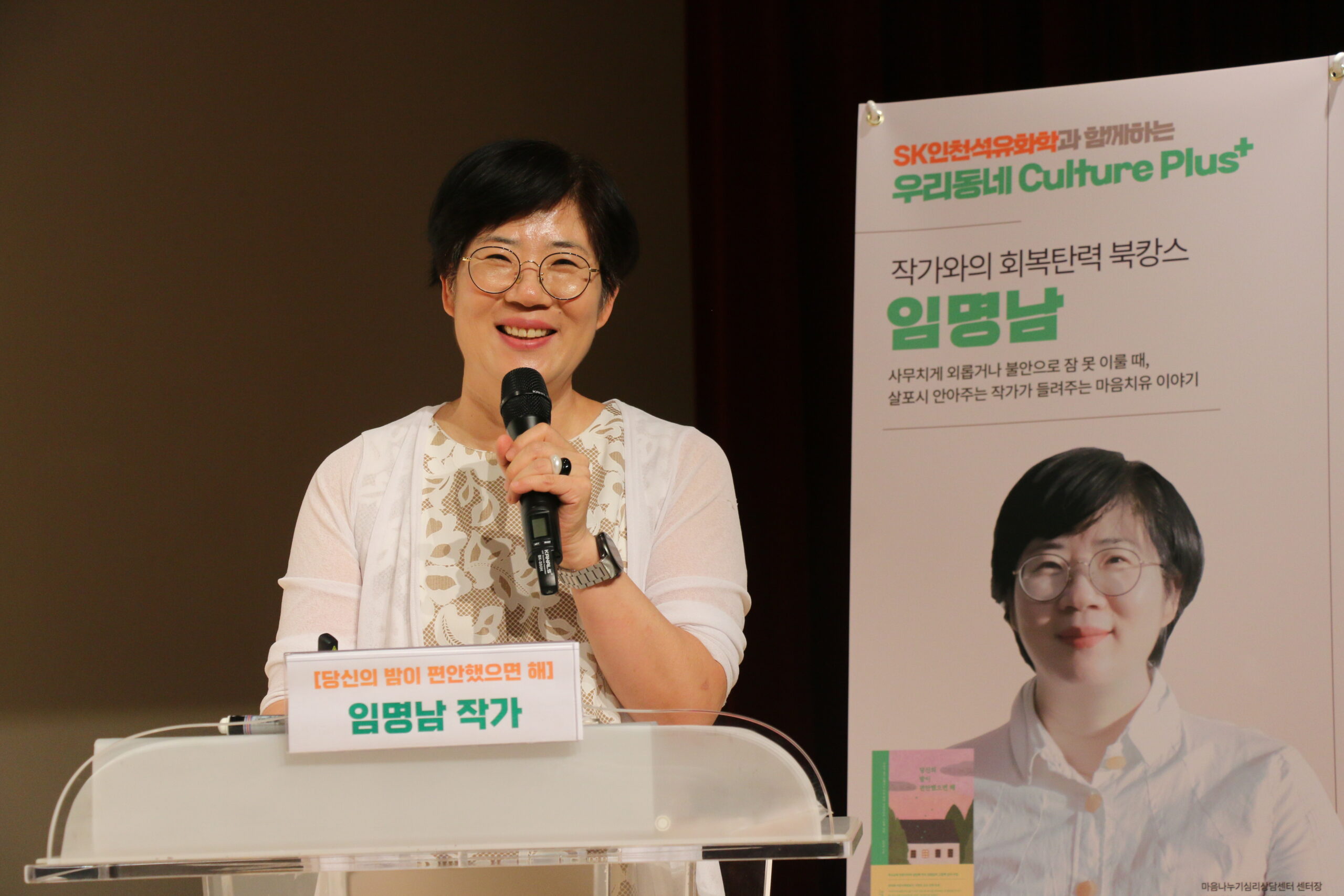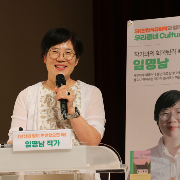 SK인천석유화학은 인천 서구청소년센터에서 지역주민 70여명이 참석한 가운데 베스트셀러 작가 초청 북 콘서트를 진행했다. 행사에는 ‘당신의 밤이 편안했으면 해’의 저자 임명남 작가가 나와 마음치유를 주제로 강연을 진행했다.