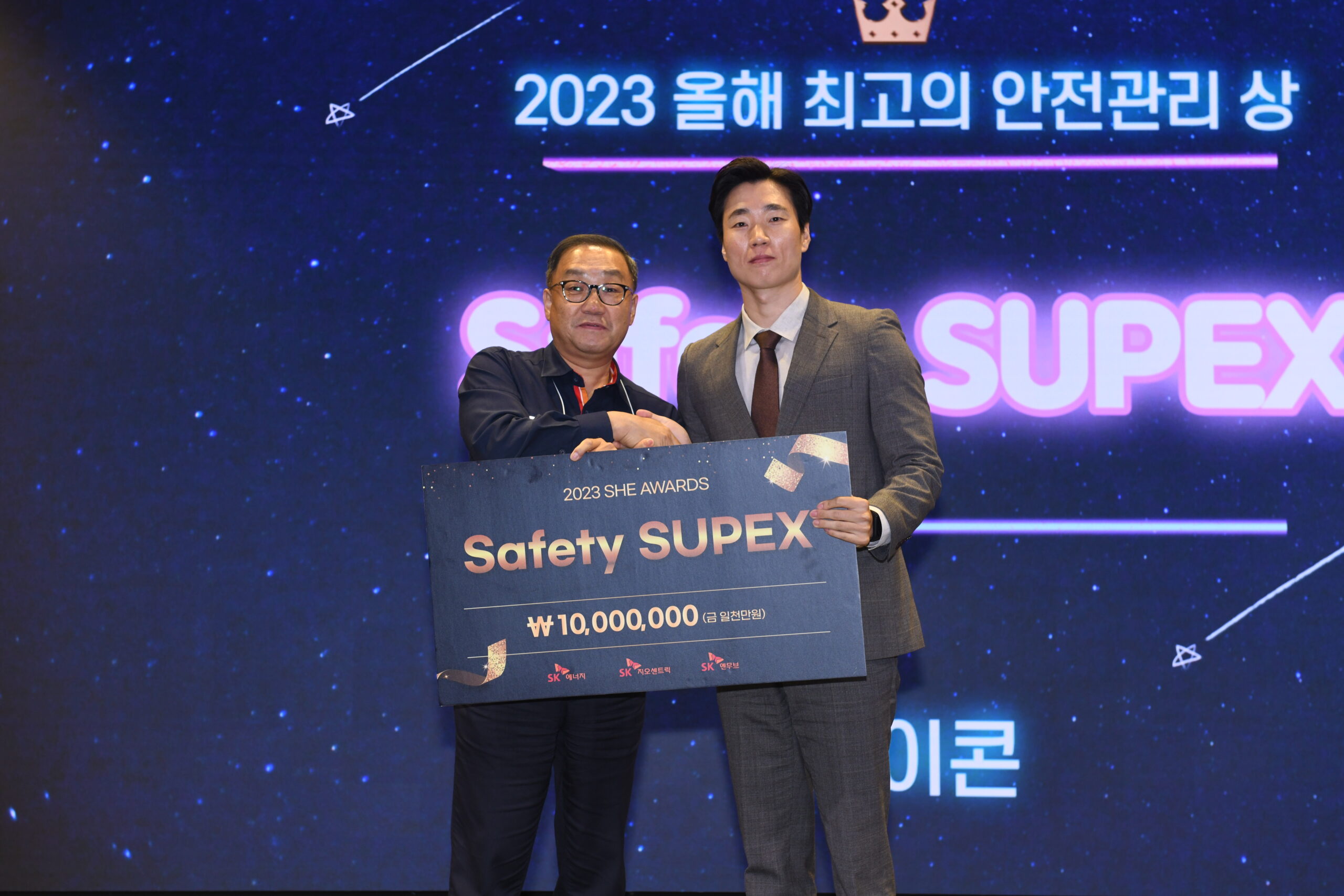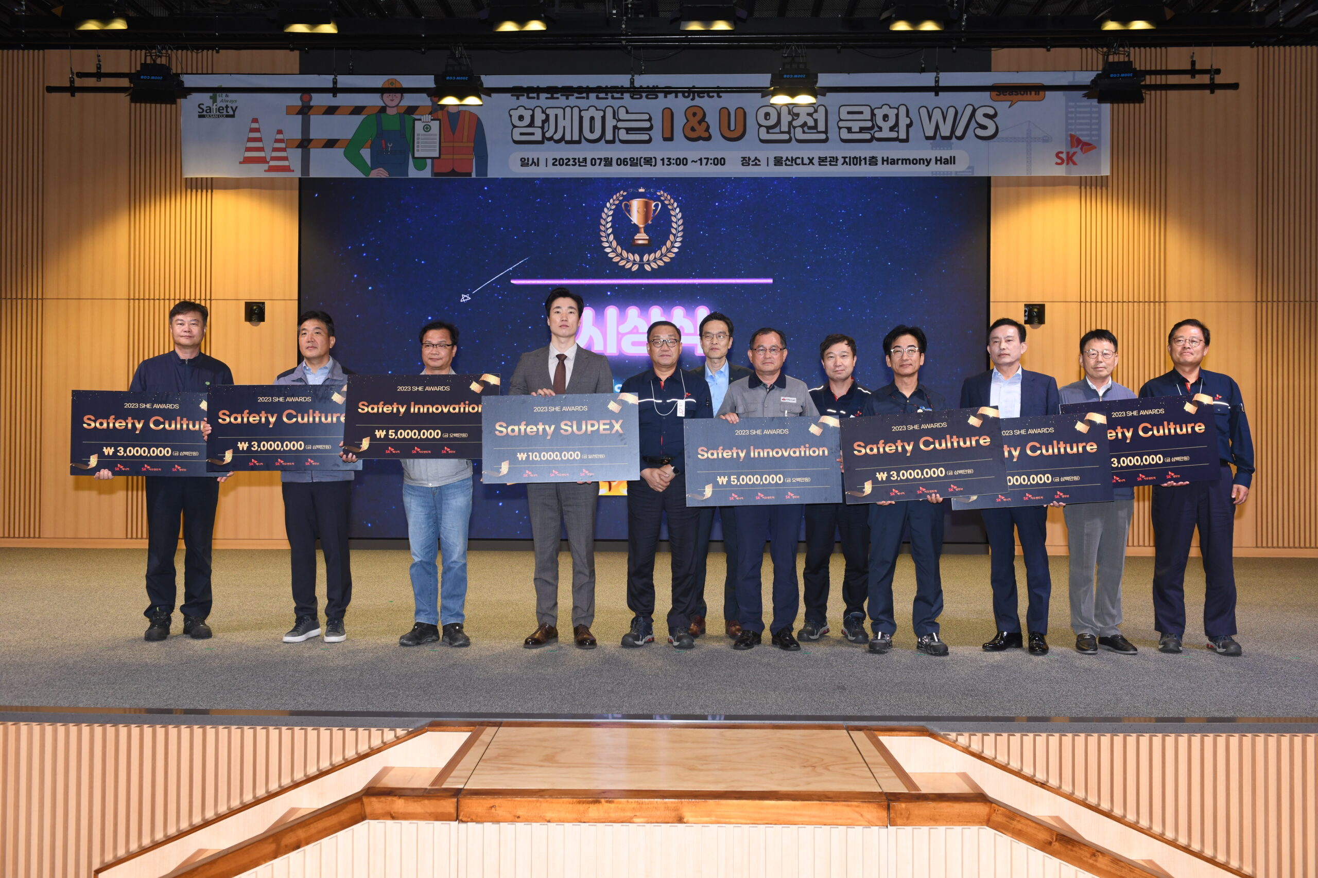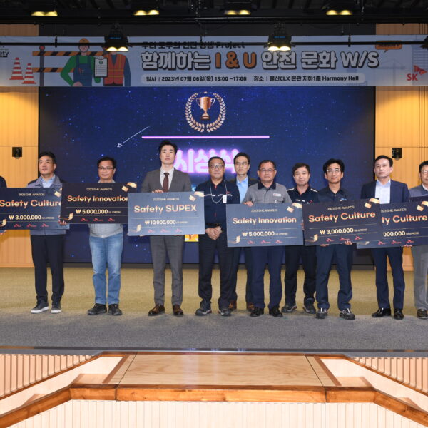 워크샵 마지막 순서로 SHE 평가 결과에 따른 협력사 포상이 진행됐다. 유재영 SK이노베이션 울산CLX 총괄부사장은 ㈜제이콘 등 8개 협력사에 총 3천 5백만원의 포상금을 전달하며 감사와 격려의 인사를 전했다.