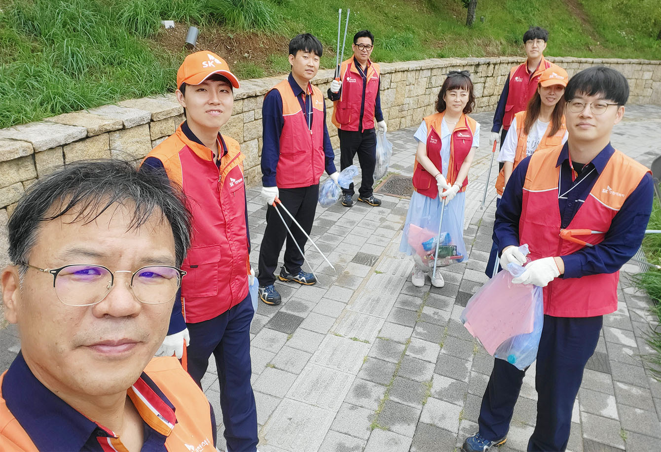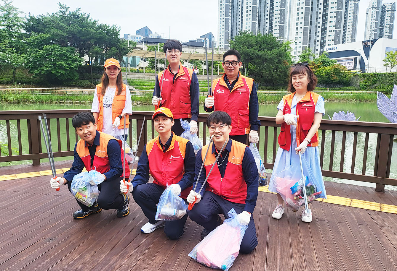 ▲ 7월 12일, 회사 인근 지역 공원에서 ‘산해진미’ 플로깅 활동을 진행 중인 SK인천석유화학 생산관리 Unit 구성원들