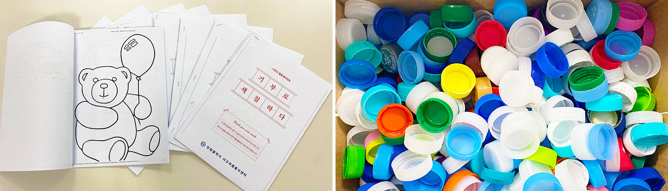 ▲ SK인천석유화학 구성원들이 ‘기부어북’ 활동을 통해 제작한 컬러링북(좌)과 ‘모아스타’ 활동을 통해 모은 페트병 뚜껑(우)