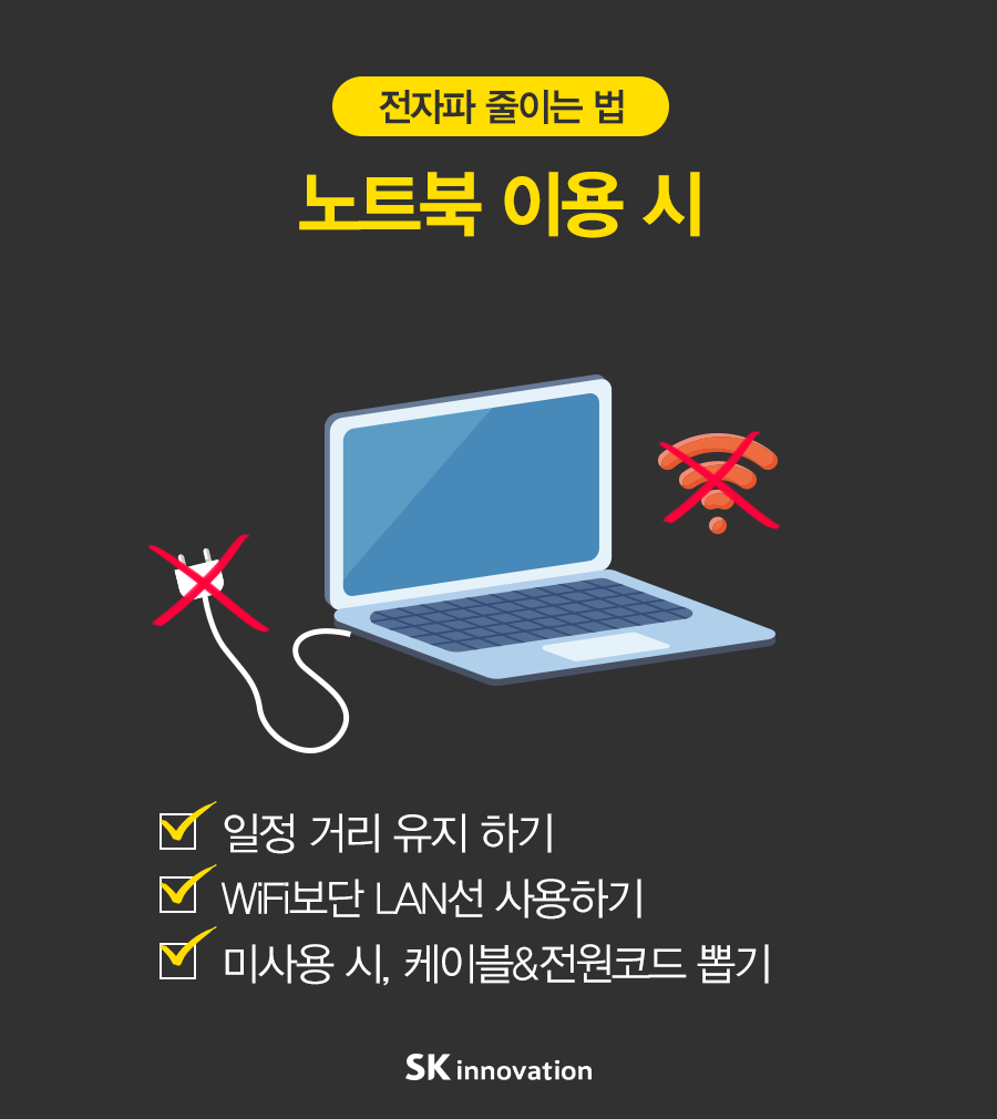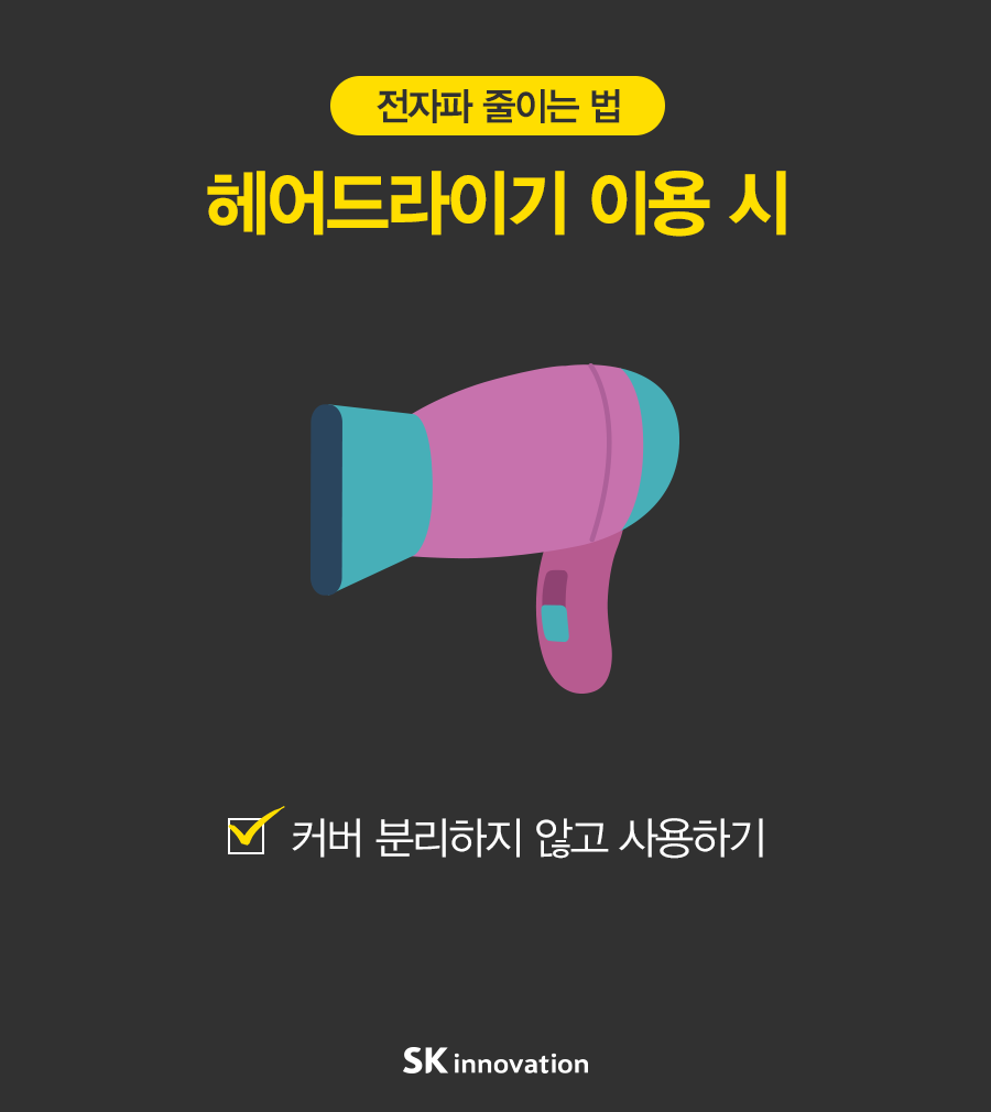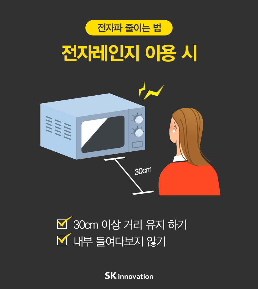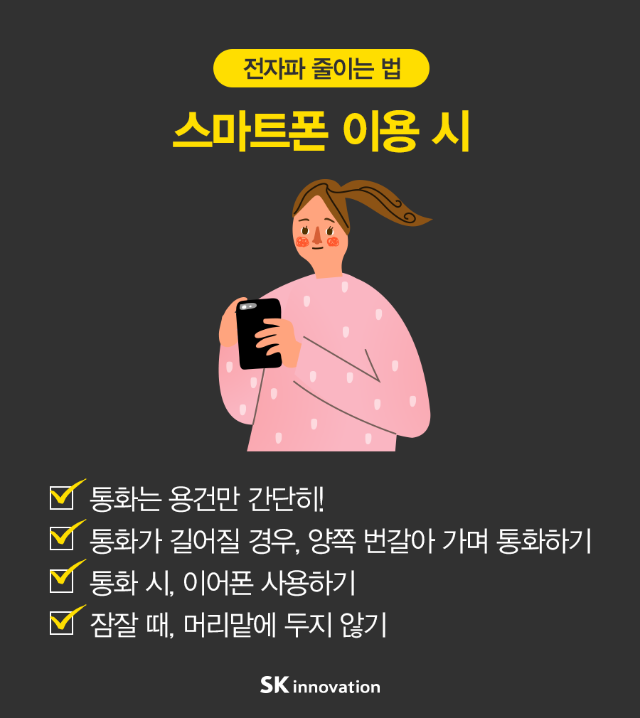 [카드뉴스] 생활 속 전자파 줄이는 습관 2016. 06. 08 SK이노베이션 [카드뉴스] 생활 속 전자파 줄이는 습관 AI 요약 AI 보이스 미디어 키트 이전글 전자파 전자파 줄이는 법 전자파 줄이는 습관 다음글 연관 콘텐츠 PRESS 일하기 좋은 기업 SK인천석유화학, ‘일·생활 균형 실천 우수기업’ 선정 2019.11.29 PRESS 생활 속 작은 실천을 통한 사회적가치 창출은 계속된다! – SK이노베이션 친환경 캠페인 아.그.위.그. 캠페인 시즌 2 2019.08.16 PRESS “일상 생활 속 작은 실천으로 친환경 사업장 만들어요” SK이노베이션 주요 사업장, 아그위그 일환 친환경 캠페인 진행 2019.06.24 . 일상 속 건강해지는 습관! <제대로 하는 법> 2016.05.16